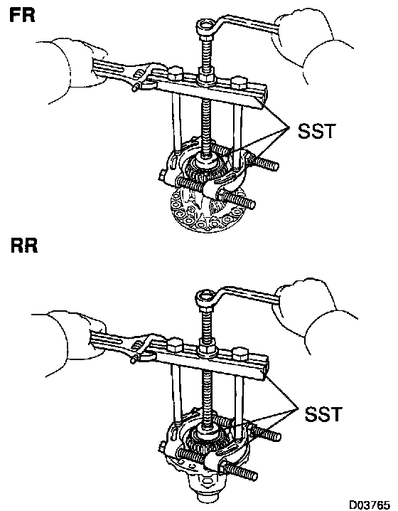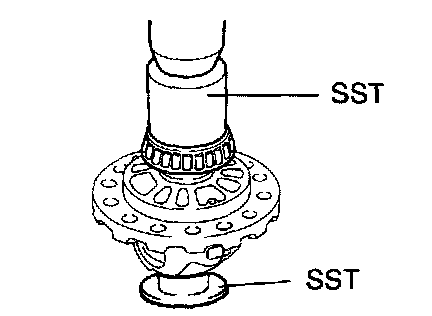 Using Special Service Tool (SST) and a press, remove the tapered roller bearing FR and RR.