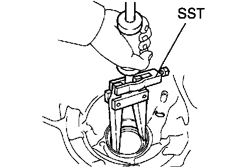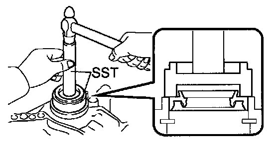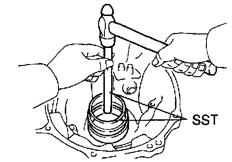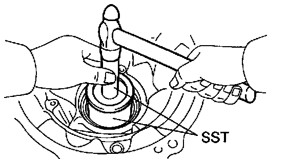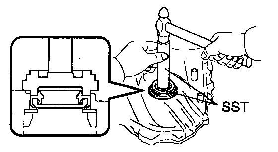 a. Using Special Service Tool (SST), a press and a hammer, press in a new bearing outer race into the transaxle housing.