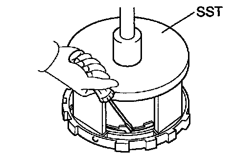 b. Place Special Service Tool (SST) on the piston return spring, and compress the piston return spring with a press.