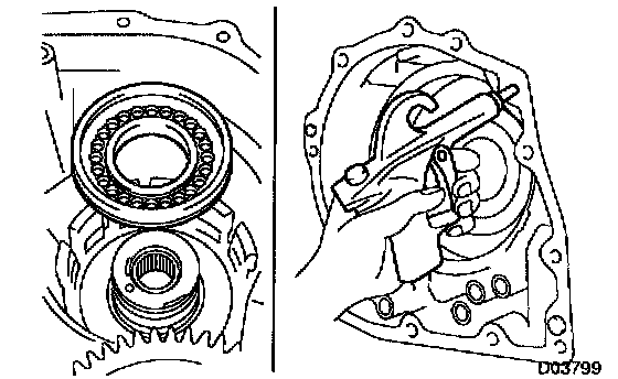 a. Remove the 2 thrust bearings, the bearing race and the front planetary sun gear from the transaxle case.