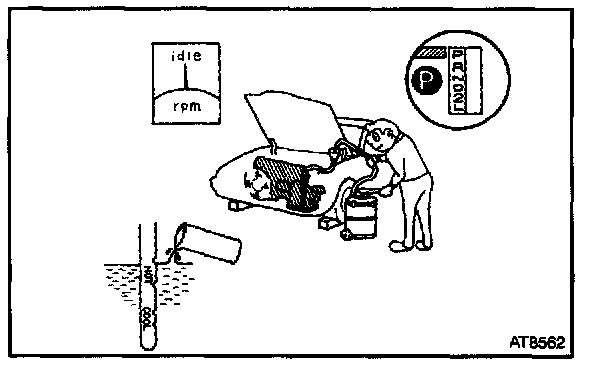 5. With the engine idling, check the fluid level. Add fluid up to the COOL level on the dipstick.