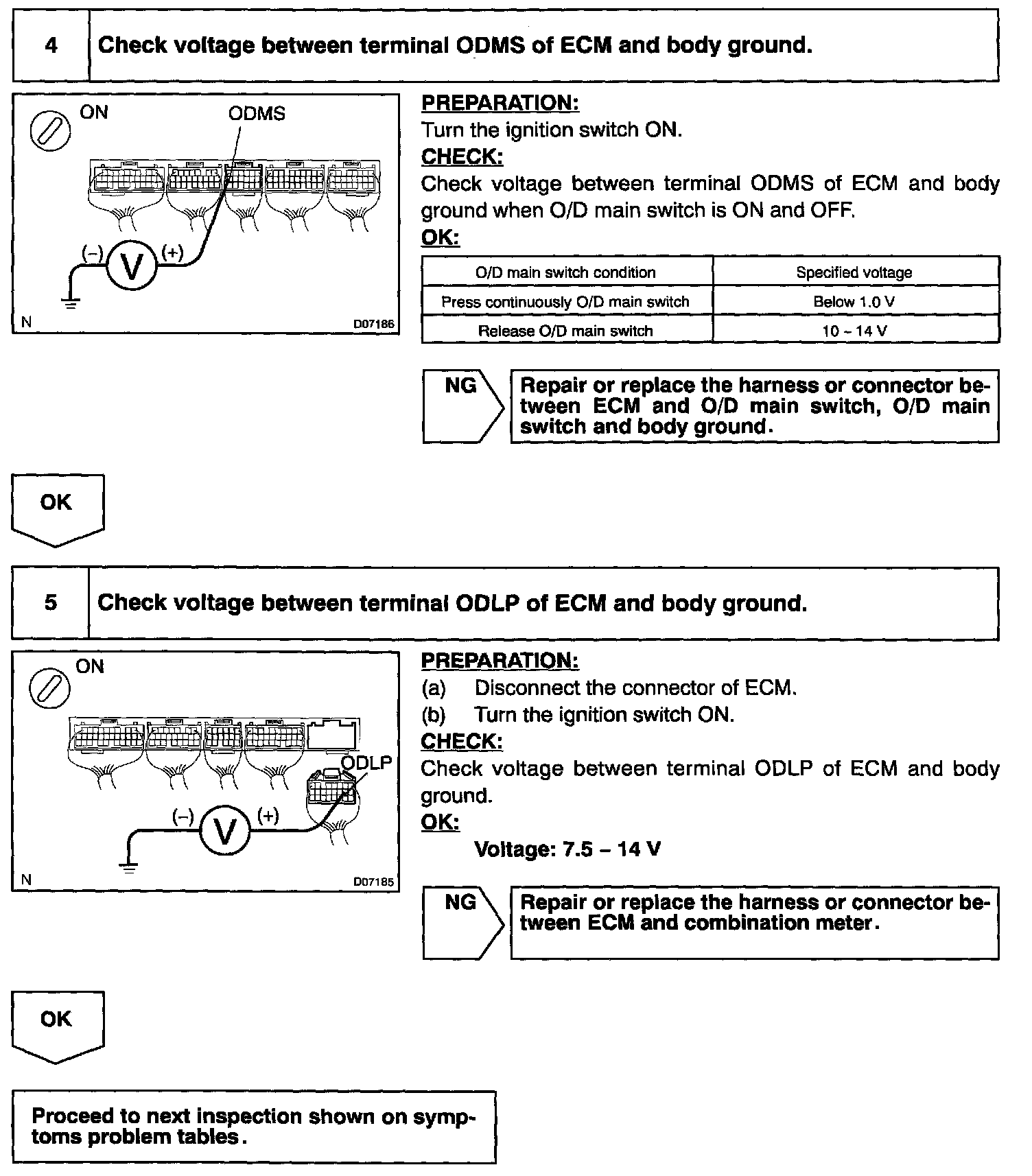 CIRCUIT DESCRIPTIONThe O/D main switch is a momentary type switch. When pressing the O/D main switch, the O/D OFF indicator light lights up and ECM prohibits shifting to O/D, and when pressing it again, the O/D OFF indicator light goes off and ECM allows shifting to O/D. Turning the IG switch OFF will reset the O/D OFF indicator light.
