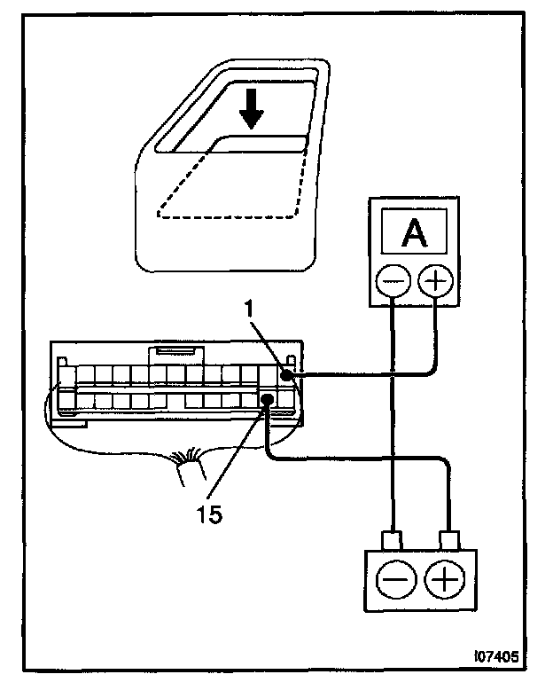 b. Connect the positive (+) lead from the ammeter to terminal 1 on the wire harness side connector and the negative (-) lead to negative terminal of the battery.