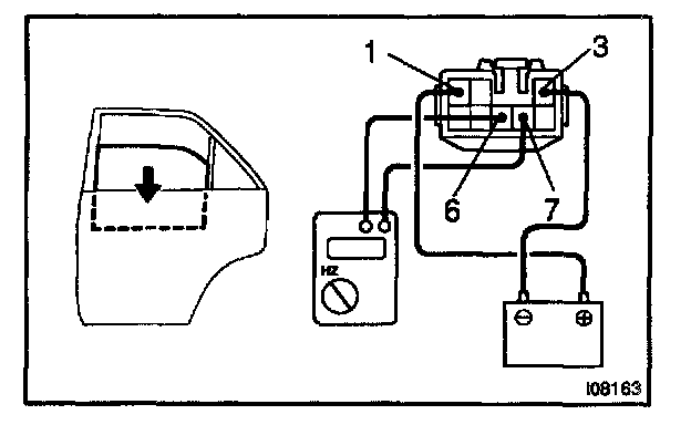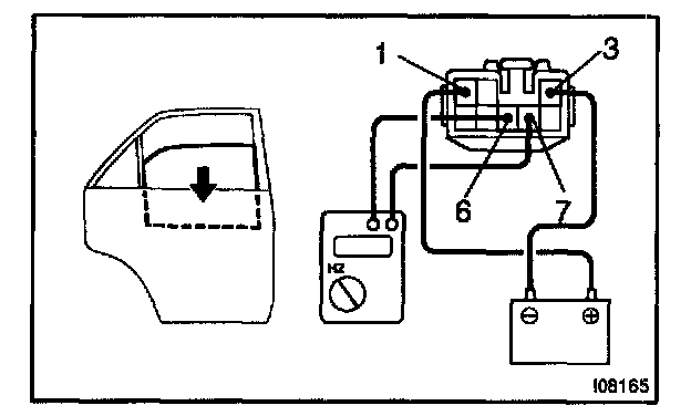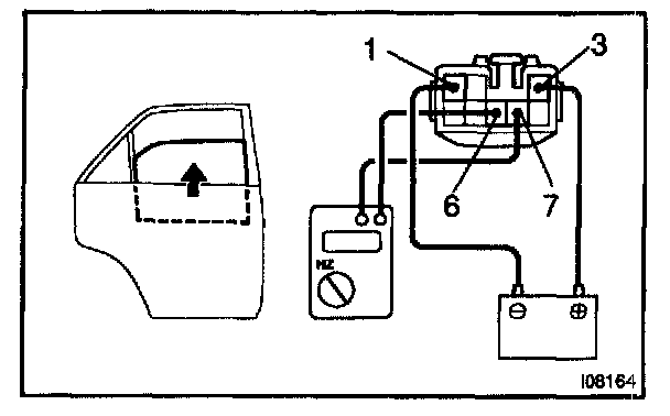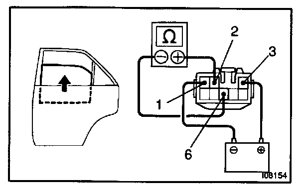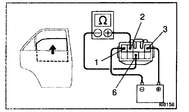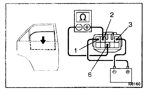 f. Approximately 60 seconds later, connect the positive (+) lead from the battery to terminal 3 and the negative (-) lead to terminal 1, and check that the window begins to descend.