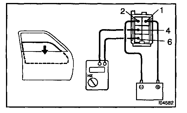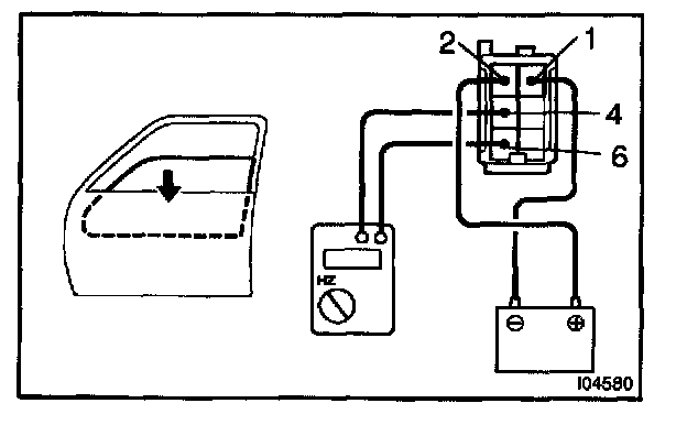 f. Approximately 60 seconds later, connect the positive (+) lead from the battery to terminal 1 and negative (-) lead to terminal 2, and check that the window begins to descended.