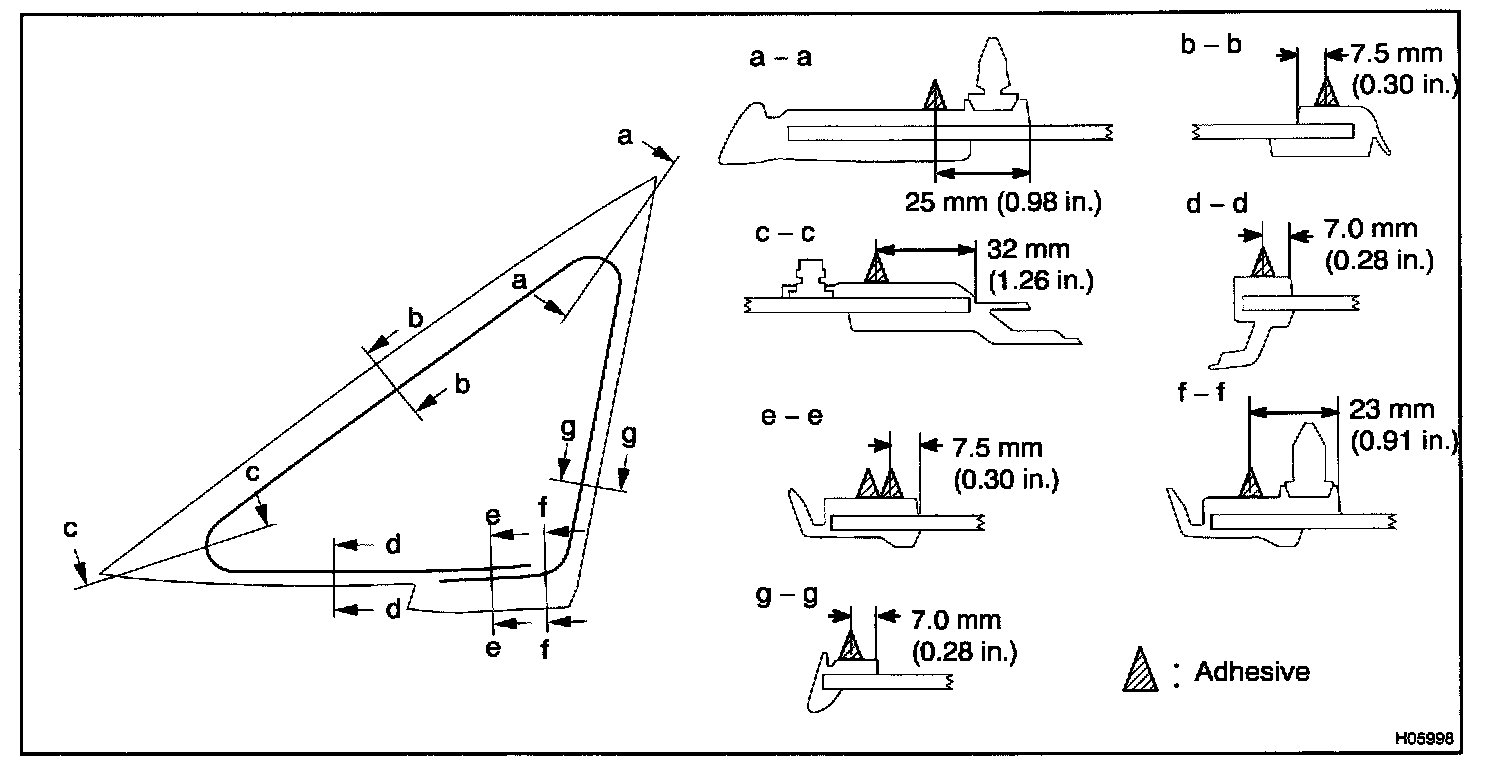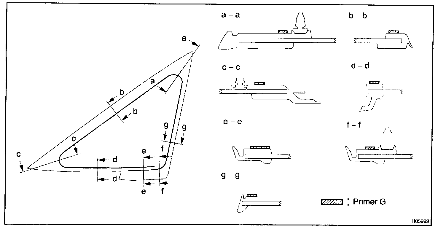 a. Using a brush or sponge, coat the edge of the glass and the contact surface with Primer G as shown in the illustration.