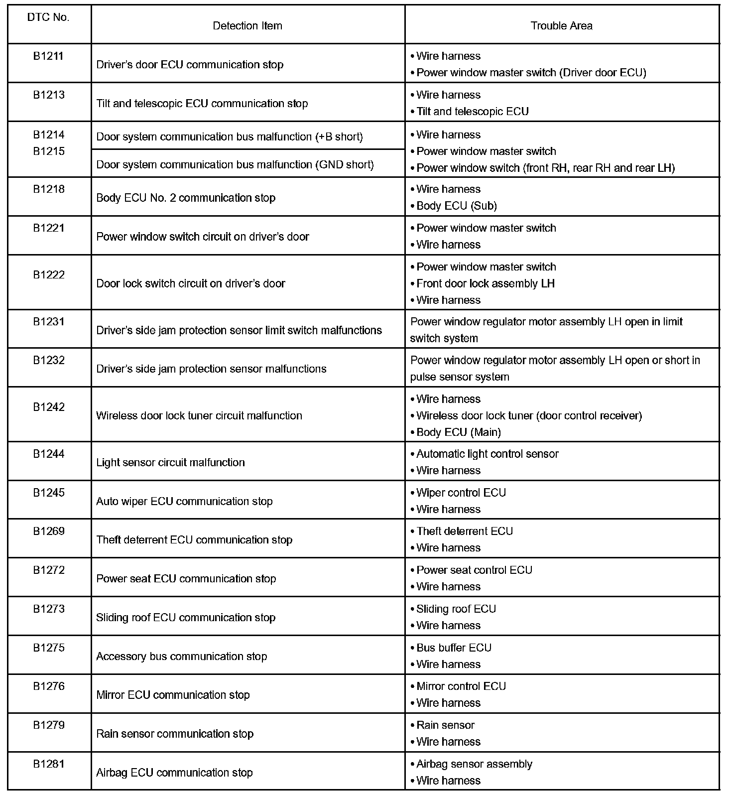 - When DTC of "+B or GND short malfunction of communication bus (such as B1214, B1215 etc.)" and "communication stop (such as B1211, B1212 etc.)" is detected simultaneously, please repair DTC of +B or GND short malfunction of communication bus first.