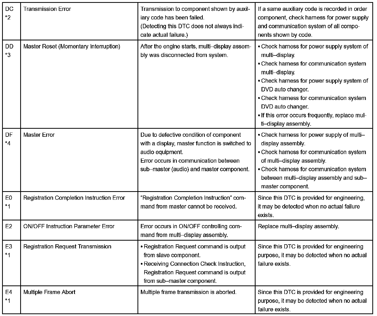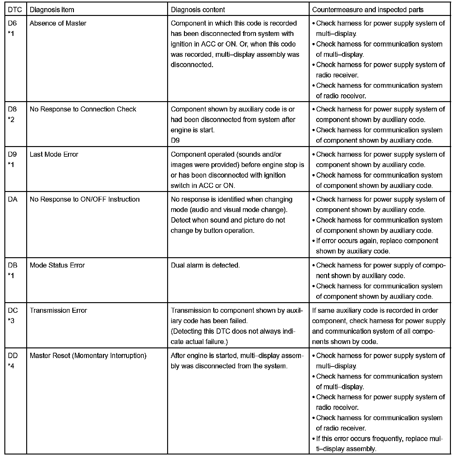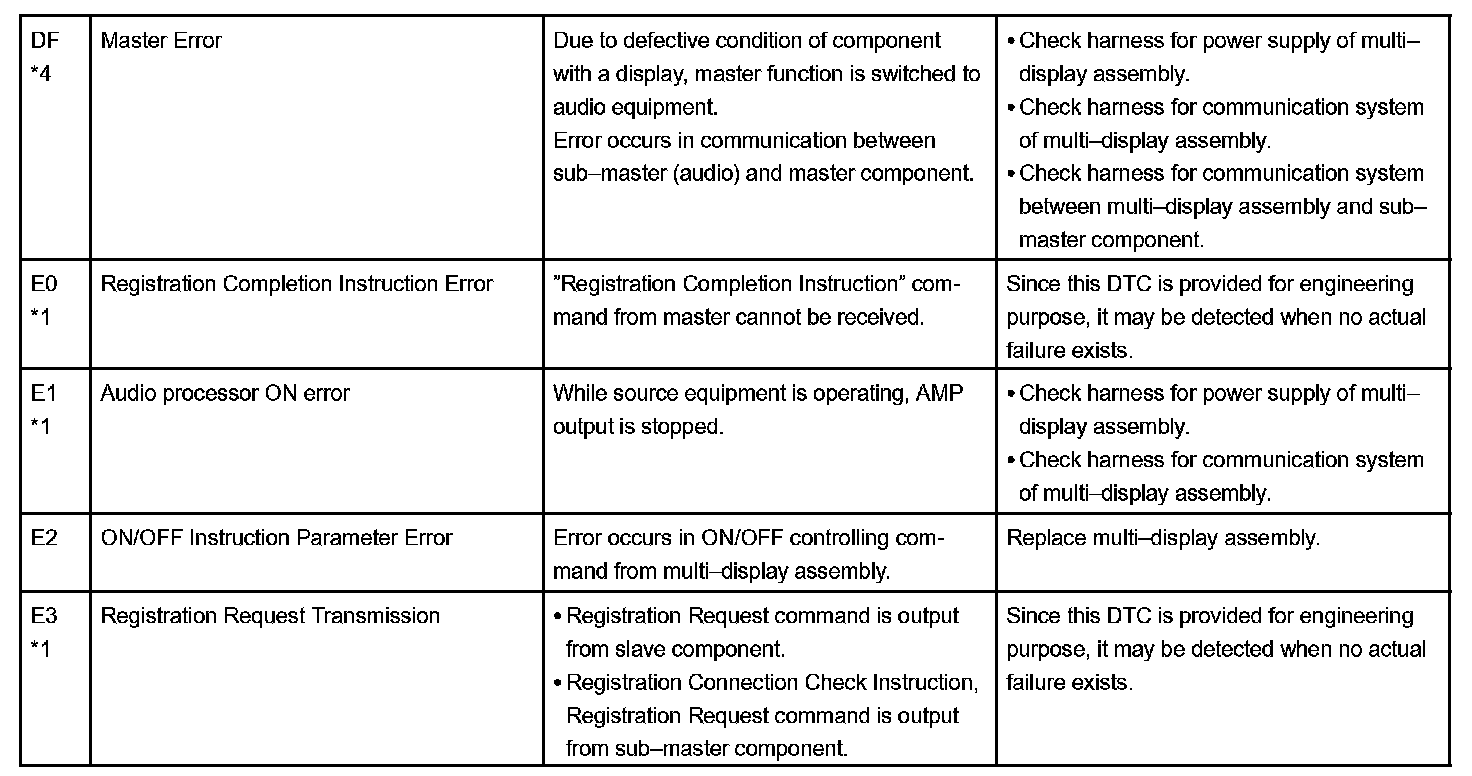 - *4: When 210 sec. have passed after pulling out the power supply connector of the master component with the ignition switch in ACC or ON, this code is stored.