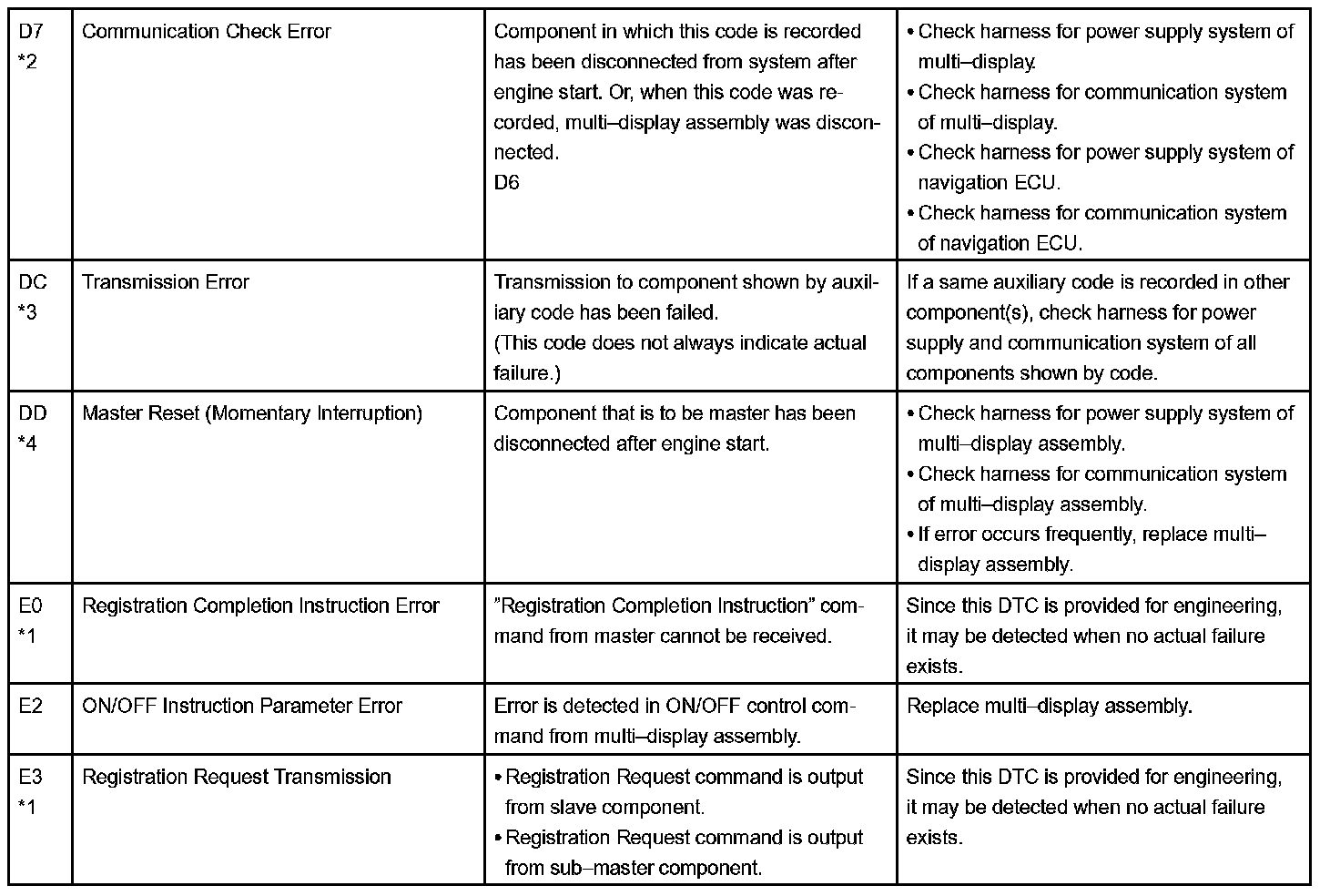 - *2: When 210 sec. has passed after pulling out the power supply connector of the master component with the ignition switch in ACC or ON, this code is stored.