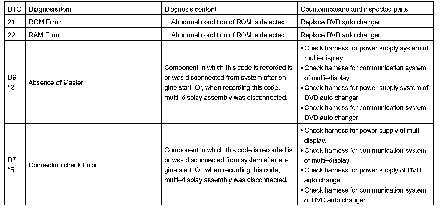 - *5: When 210 sec. has passed after pulling out the power supply connector of the master component with the ignition switch in ACC or ON, this code is stored.