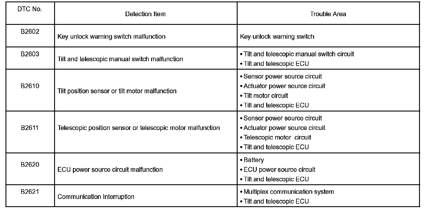 If a DTC is displayed during the DTC check, check the circuit for that code listed in the table. For details of each code, refer to the respective "DTC No." in the DTC chart.