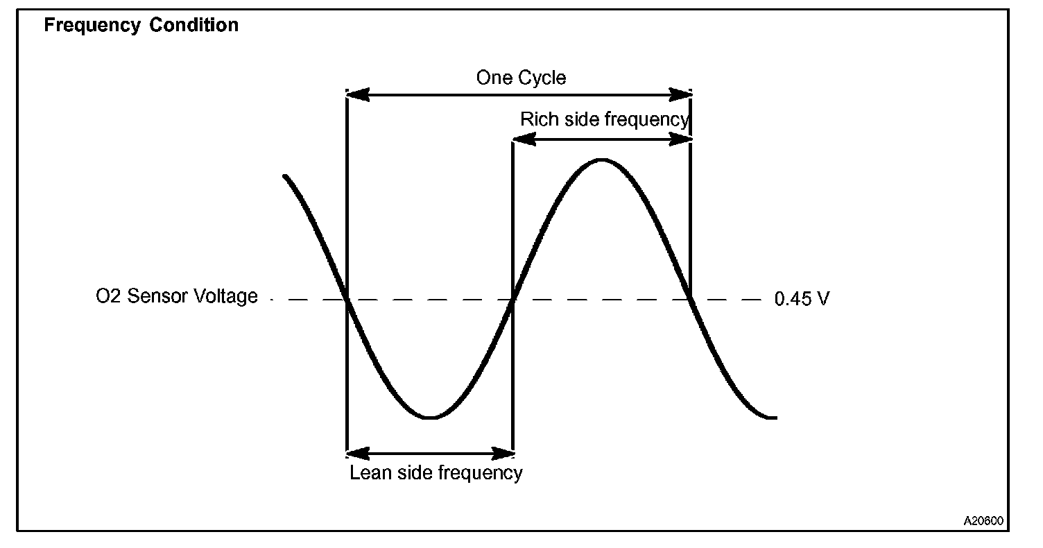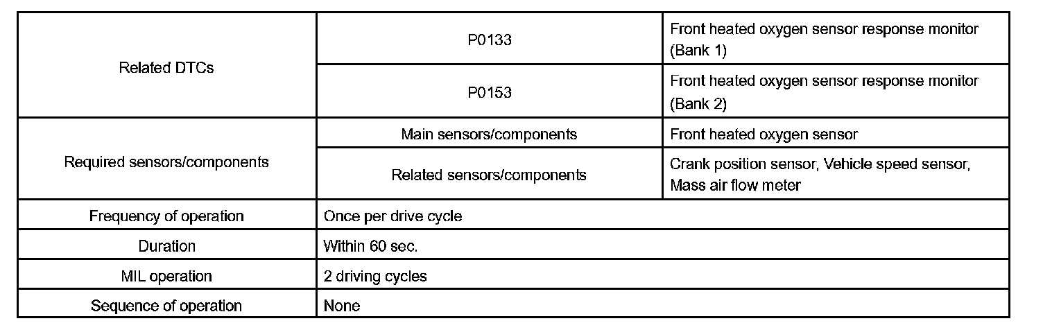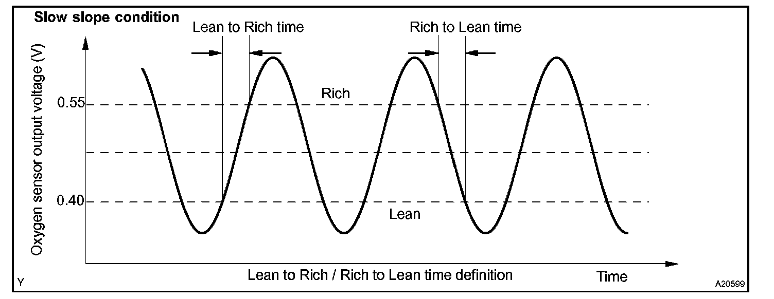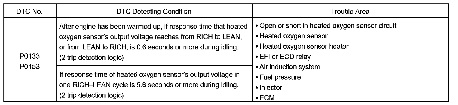 The ECM monitors the response feature of the heated oxygen sensor. If the response time of the heated oxygen sensor output status change from RICH to LEAN or vice-versa becomes longer, the ECM interprets this as a malfunction in the heated oxygen sensor and sets a DTC.