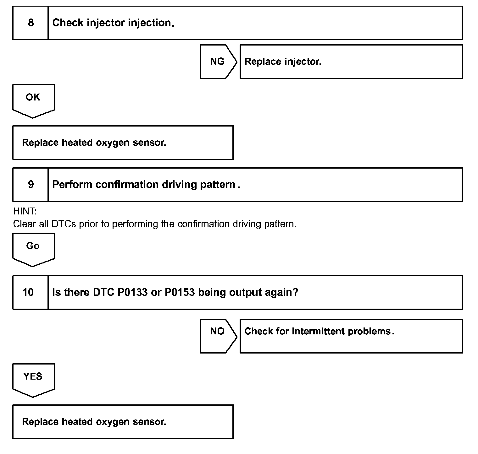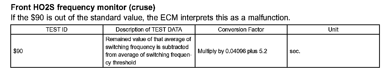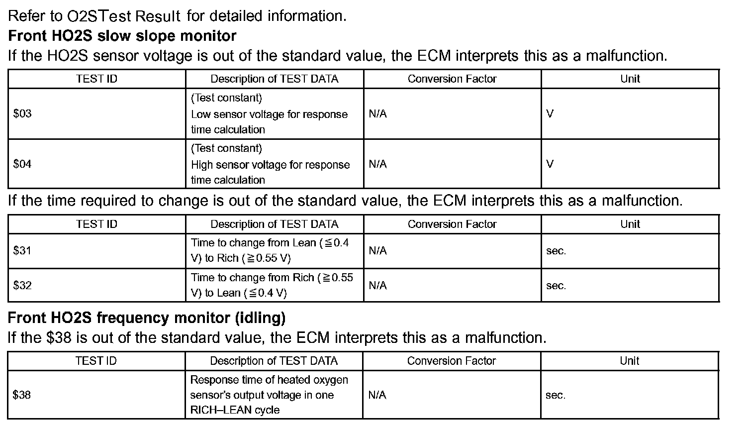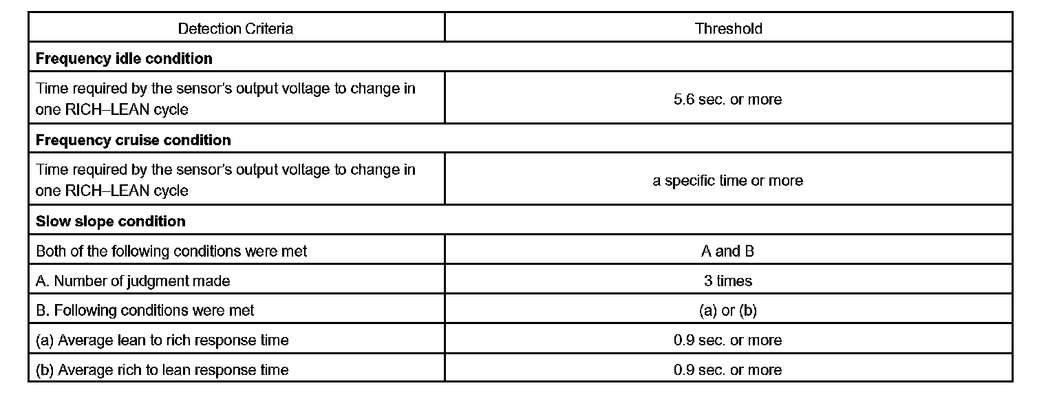 The ECM monitors the response feature of the heated oxygen sensor. If the response time of the heated oxygen sensor output status change from RICH to LEAN or vice-versa becomes longer, the ECM interprets this as a malfunction in the heated oxygen sensor and sets a DTC.