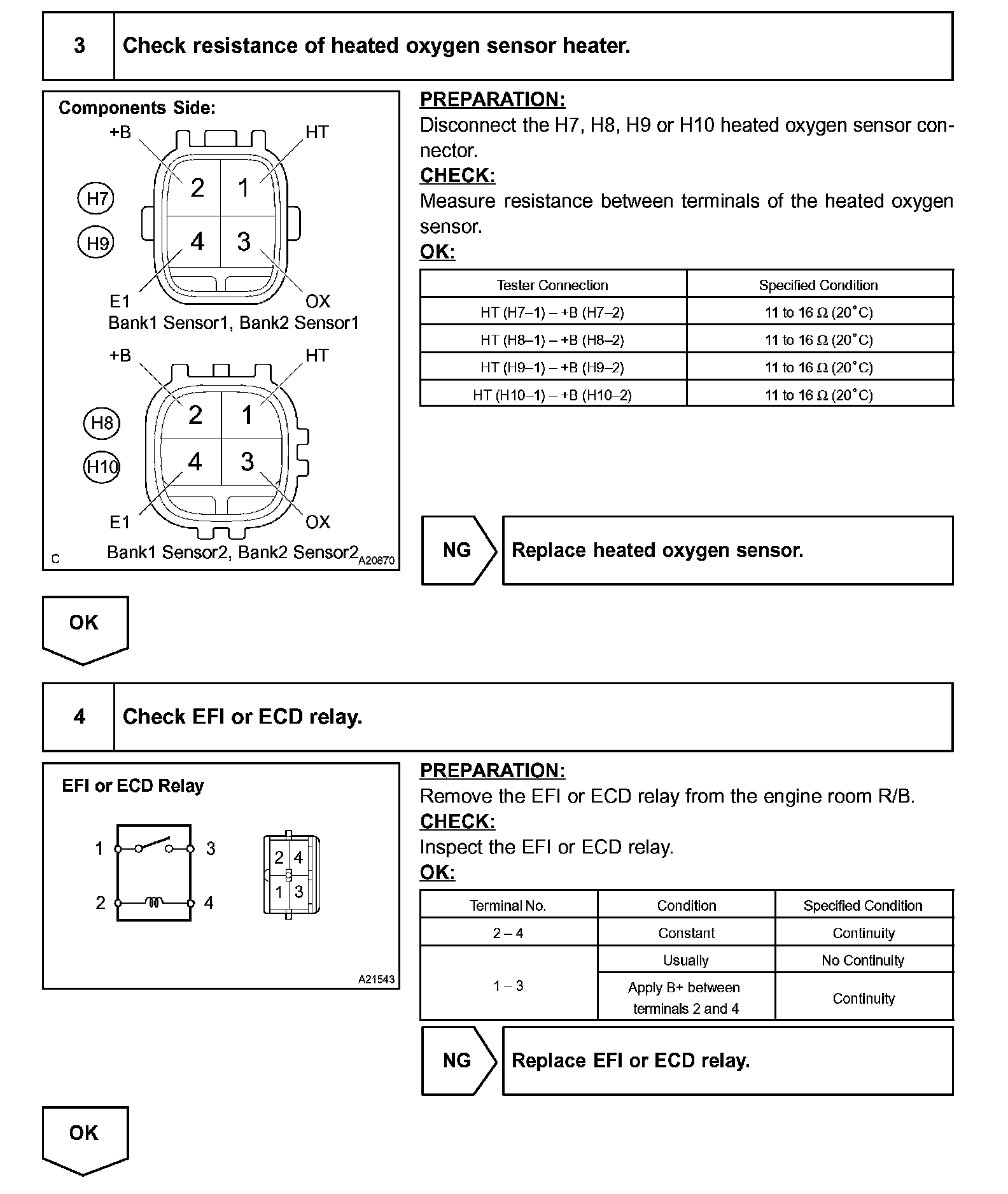 When the air fuel ratio is RICHER than the stoichiometric air fuel ratio, the oxygen concentration in the exhaust gas is reduced and the heated oxygen sensor informs the ECM of the RICH condition (high voltage, i.e. more than 0.45 V). The ECM judges by the voltage output from the heated oxygen sensor whether the air fuel ratio is RICH or LEAN and controls the injection time accordingly. However, if malfunction of the heated oxygen sensor causes output of abnormal voltage, this disables the ECM for performing an accurate air fuel ratio control. The heated oxygen sensors include a heater which heats the zirconia element. The heater is controlled by the ECM. When the intake air volume is low (the temperature of the exhaust gas is low) current flows to the heater to heat the sensor for accurate oxygen concentration detection.