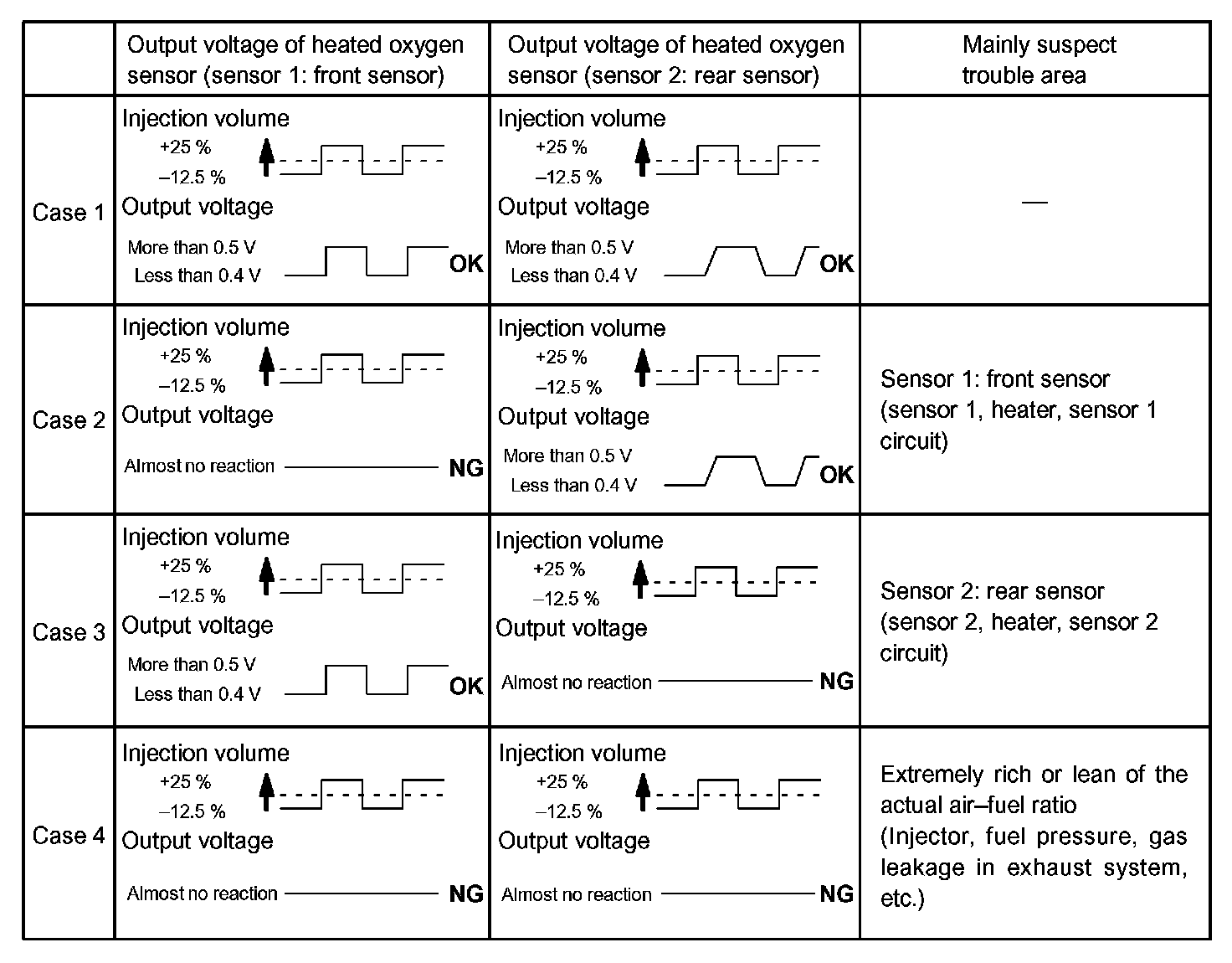 When the air fuel ratio becomes LEAN, the oxygen concentration in the exhaust increases and the heated oxygen sensor informs the ECM of the LEAN condition (low voltage, i.e. less than 0.45 V).