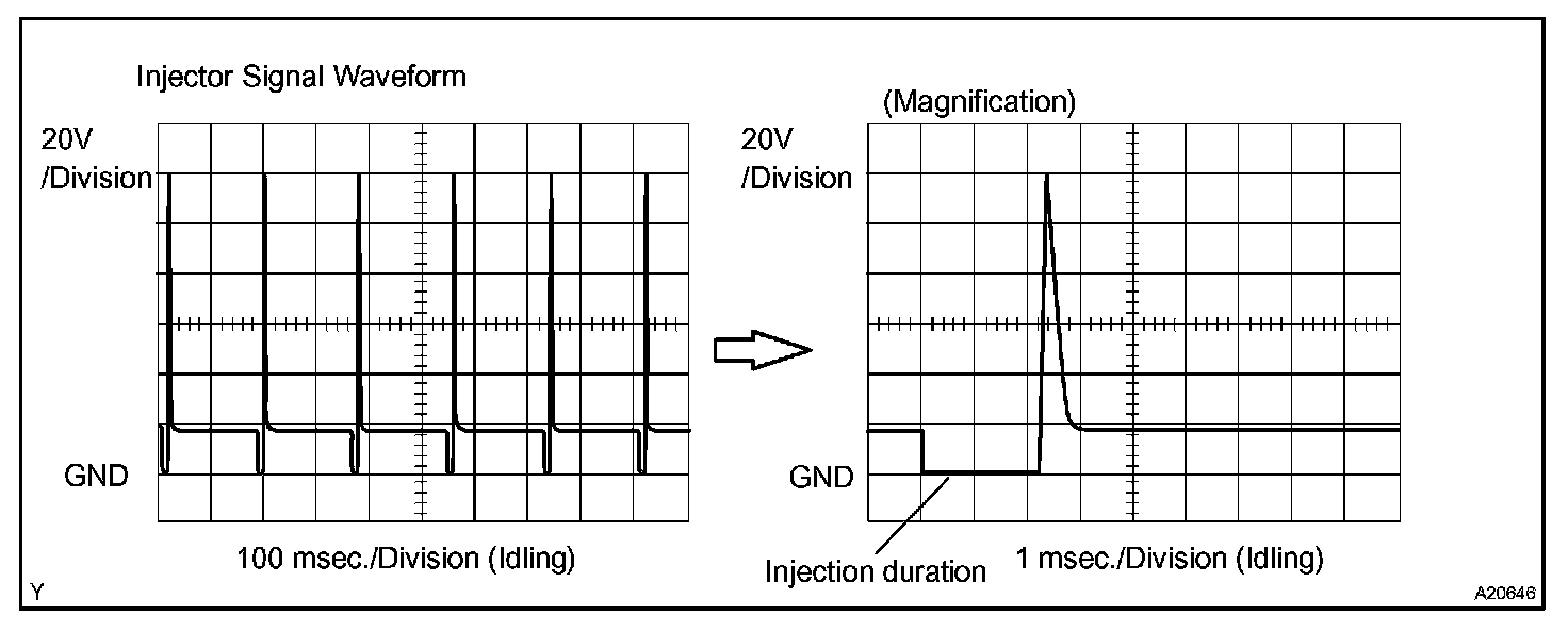 With the engine idling, check the waveform between terminals #1 to #8 and E01 of the ECM connectors.