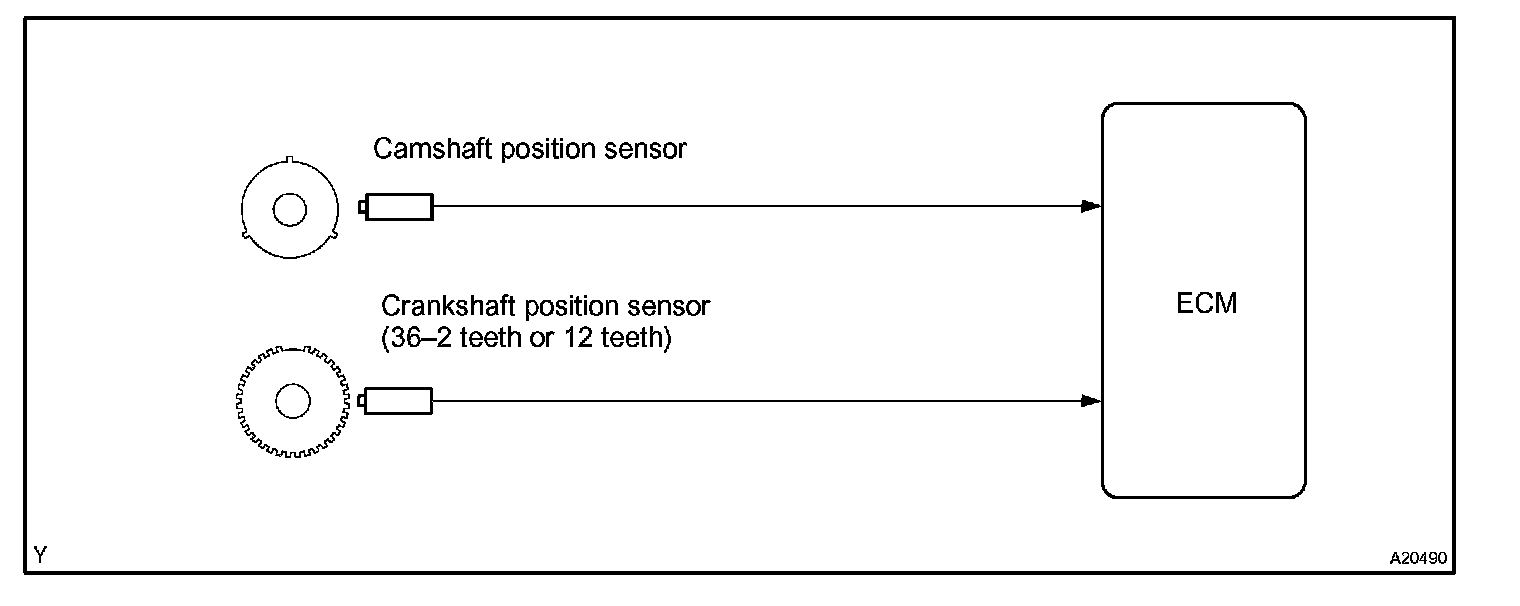 When a misfire occurs in the engine, hydrocarbons (HC) enter the exhaust in high concentrations. If this HC concentration is high enough, there could be an increase in exhaust emissions levels. High concentrations of HC can also cause to temperature of the catalyst to increase, possibly damaging the catalyst. To prevent this increase in emissions and limit the possibility of thermal damage, the ECM monitors the misfire rate. When the temperature of the catalyst reaches a point of thermal degradation, the ECM will blink the MIL. For monitoring misfire, the ECM uses both the camshaft position sensor and the crankshaft position sensor. The camshaft position sensor is used to identify misfiring cylinders and the crankshaft position sensor is used to measure variations in the crankshaft rotation speed. The misfire counter increments when crankshaft rotation speed variations exceed threshold values.