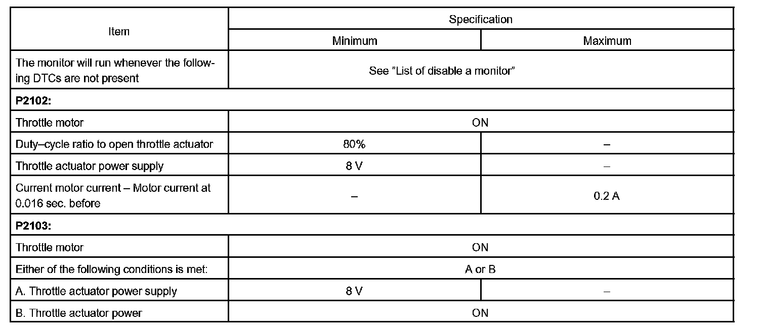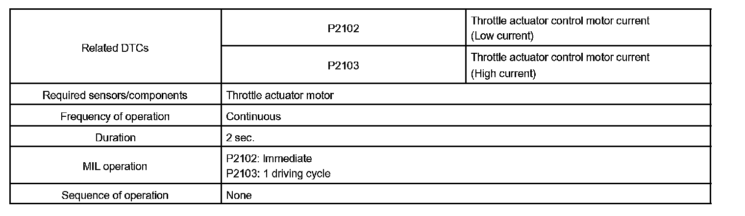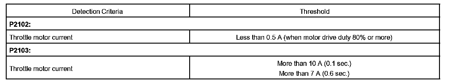 When the current is more than 10 A. Or the current is less than 0.5 A when the motor driving duty ratio is exceeding 80 %. The ECM concludes that the current is out of range, turns on the MIL and a DTC is set.