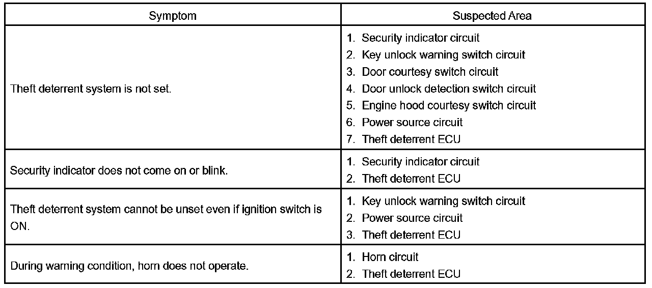 HINT: Troubleshooting of the theft deterrent system is based on the premise that the door lock control system is operating normally. Accordingly, before troubleshooting the theft deterrent system, first make certain that the door lock control system is operating normally.