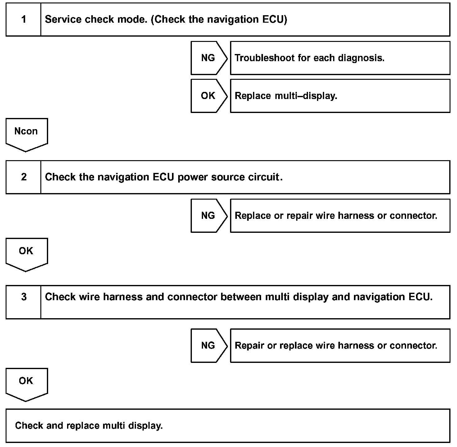 No Navigation Screen Displayed When "MAP", "Menu", or "Dest" Switch Pressed. (Screen Cannot Be Switched.)