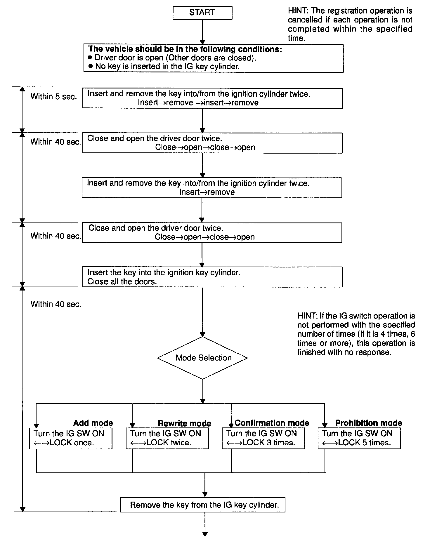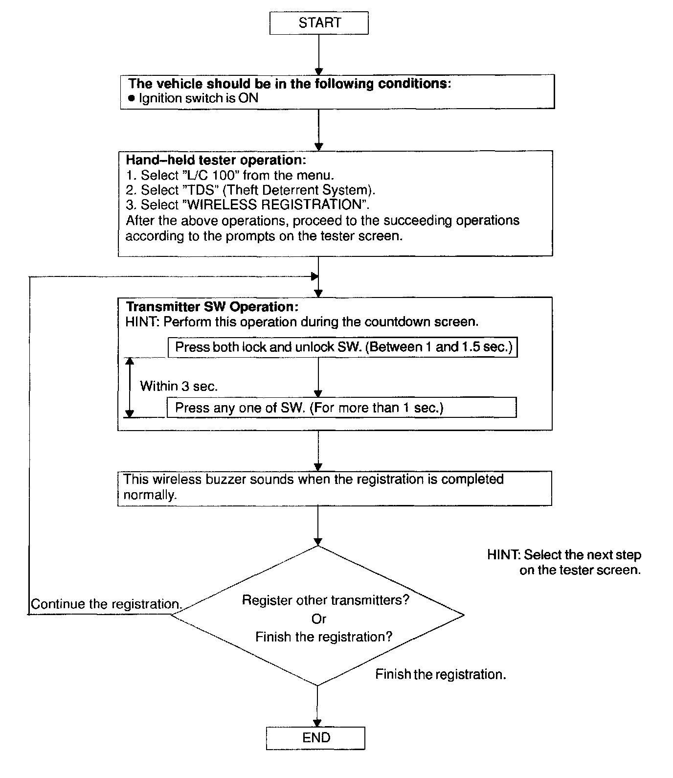 b. Follow the chart on the following page to register the transmitter recognition code to the theft deterrent ECU.
