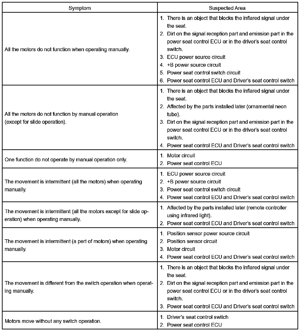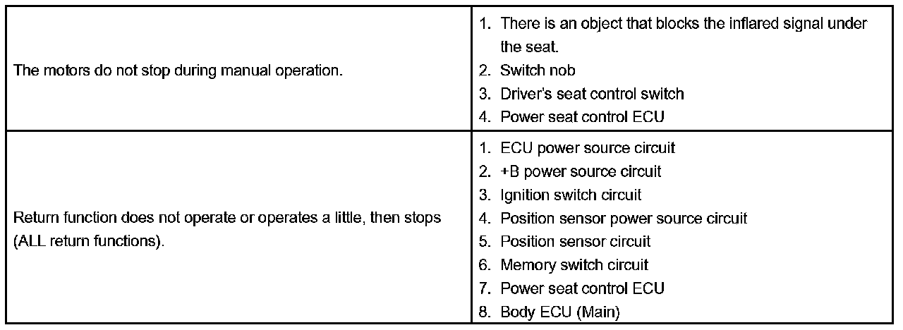 - If the trouble still reappears even though there are no abnormalities in any of the other circuits, then check and replace the Power Seat Control ECU as the last step.