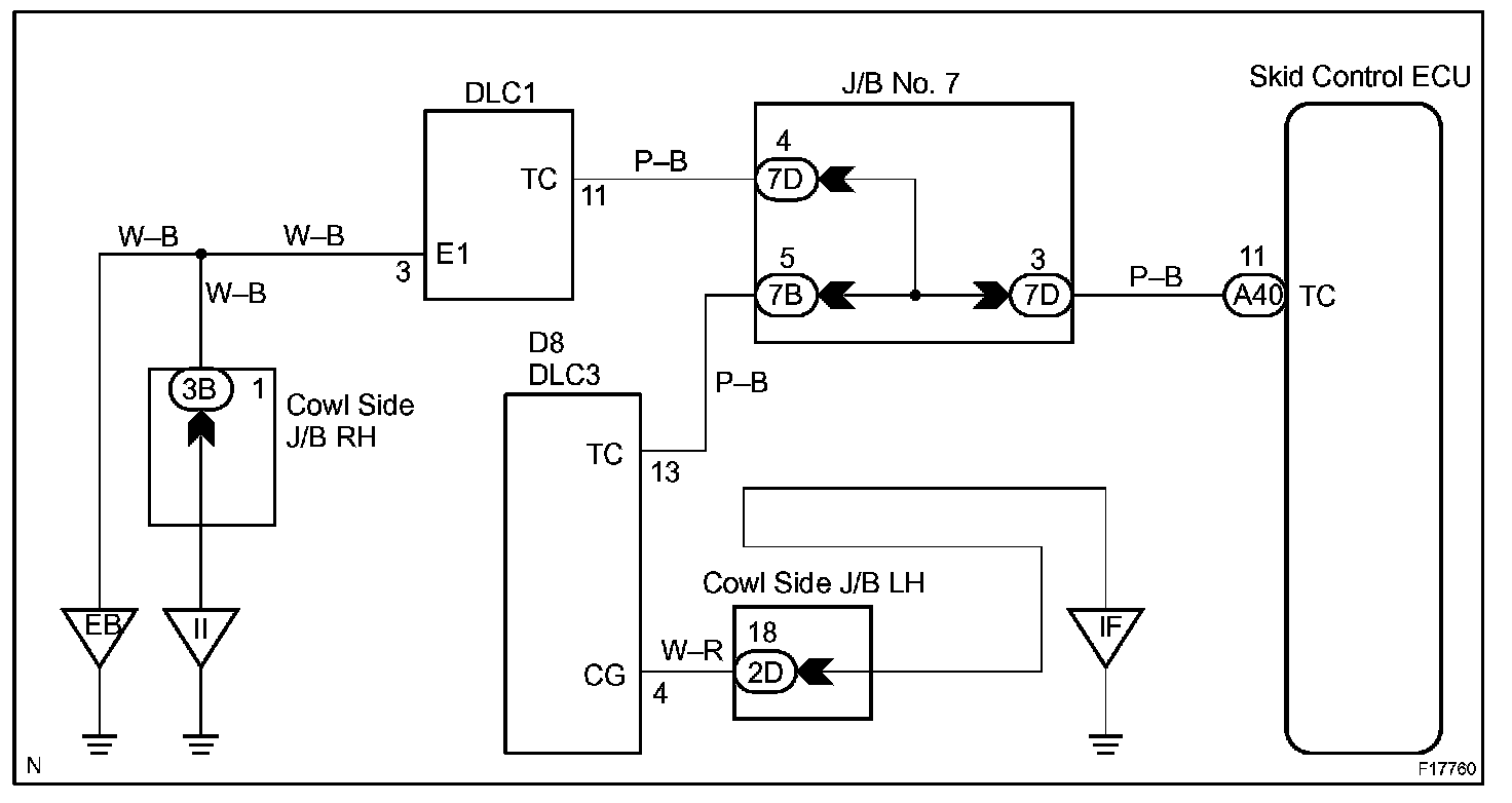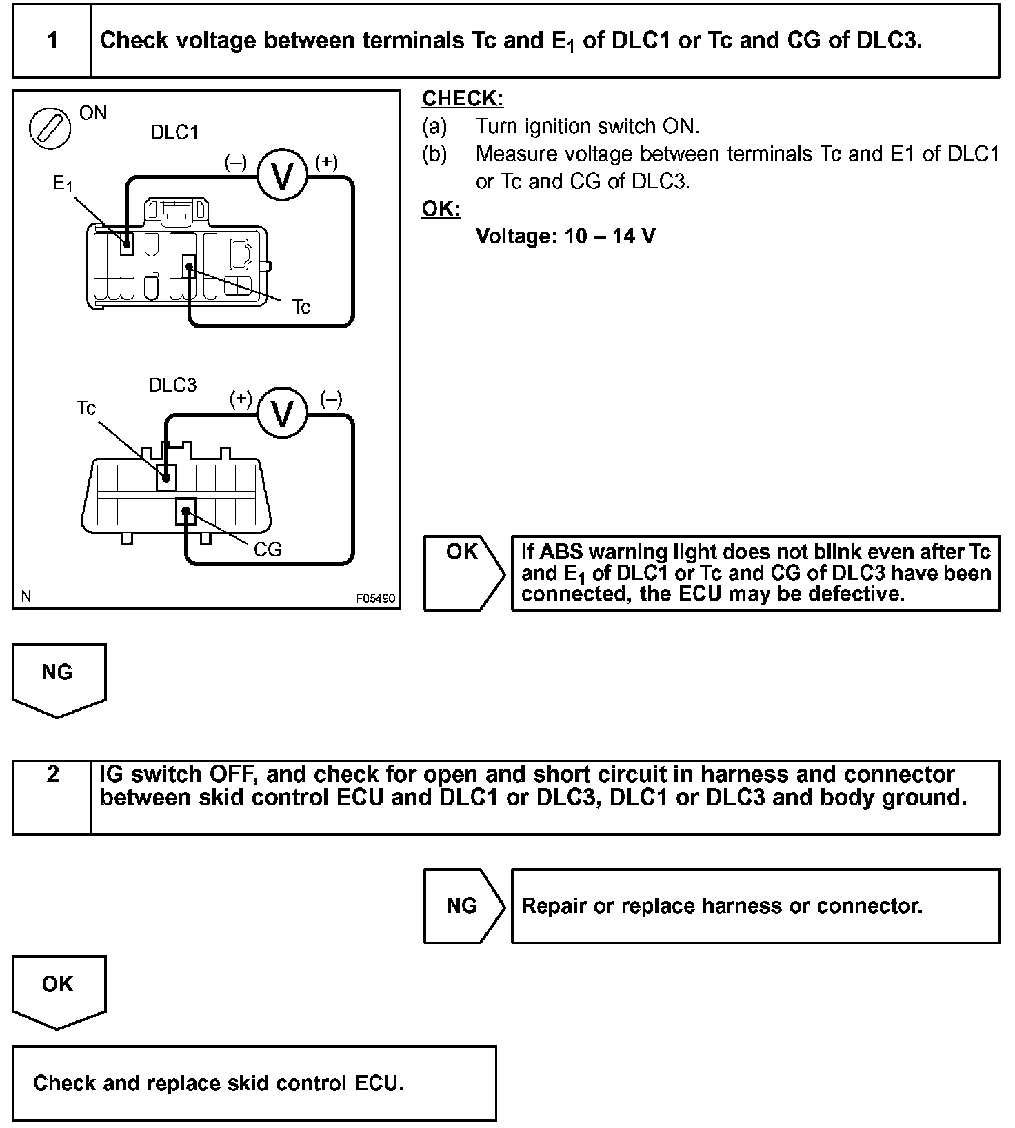 Connecting terminals Tc and E1 of DLC1 or Tc and CG of DLC3 causes the ECU to display the DTC by flashing the ABS warning light and VSC TRAC warning light.