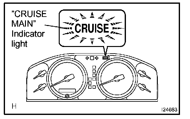2. Check that the CRUISE MAIN indicator light comes on when the cruise control main switch is turned ON, and that the indicator light goes off when the main switch is turned OFF.