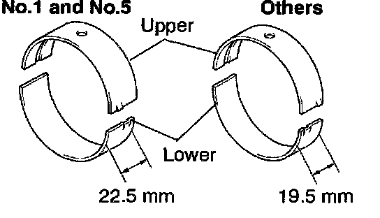 ^ Main bearings come in widths of 19.5 mm (0.768 inch) and 22.5 mm (0.886 inch). Install the 22.5 mm (0.886 inch) bearings in the No.1 and No.5 cylinder block journal positions with the main bearing cap. Install the 19.5 mm (0.768 inch) bearings in the other positions.