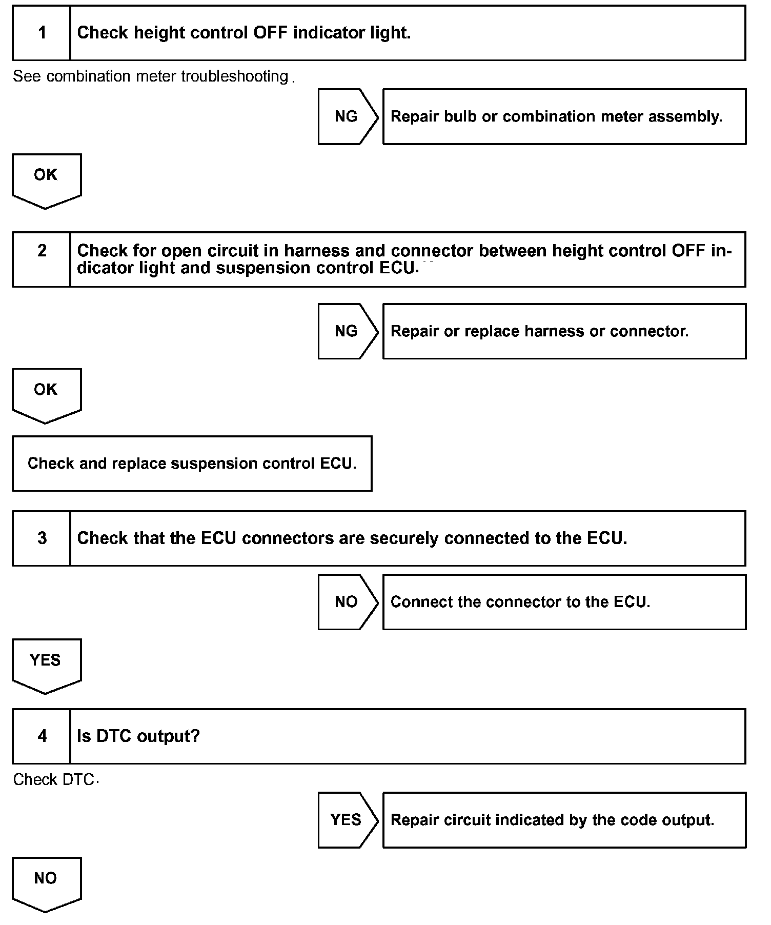 If the ECU detects a problem with the Height Control the OFF indicator light will flash. At this time, the ECU records a DTC in memory and any further height control is prohibited. DTCs in memory can be retrieved by connecting terminals Tc and E1 of the DLC1.
