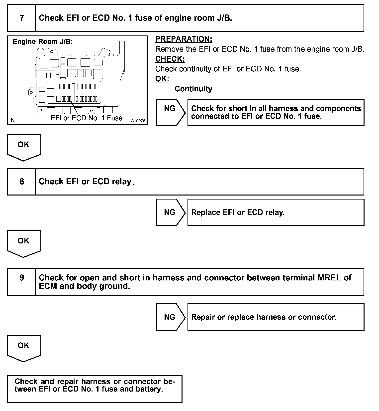 When the ignition switch is turned ON, battery positive voltage is applied to terminal IGSW of the ECM and the EFI or ECD relay control circuit in the ECM sends a signal to terminal MREL of the ECM switching on the EFI or ECD relay.