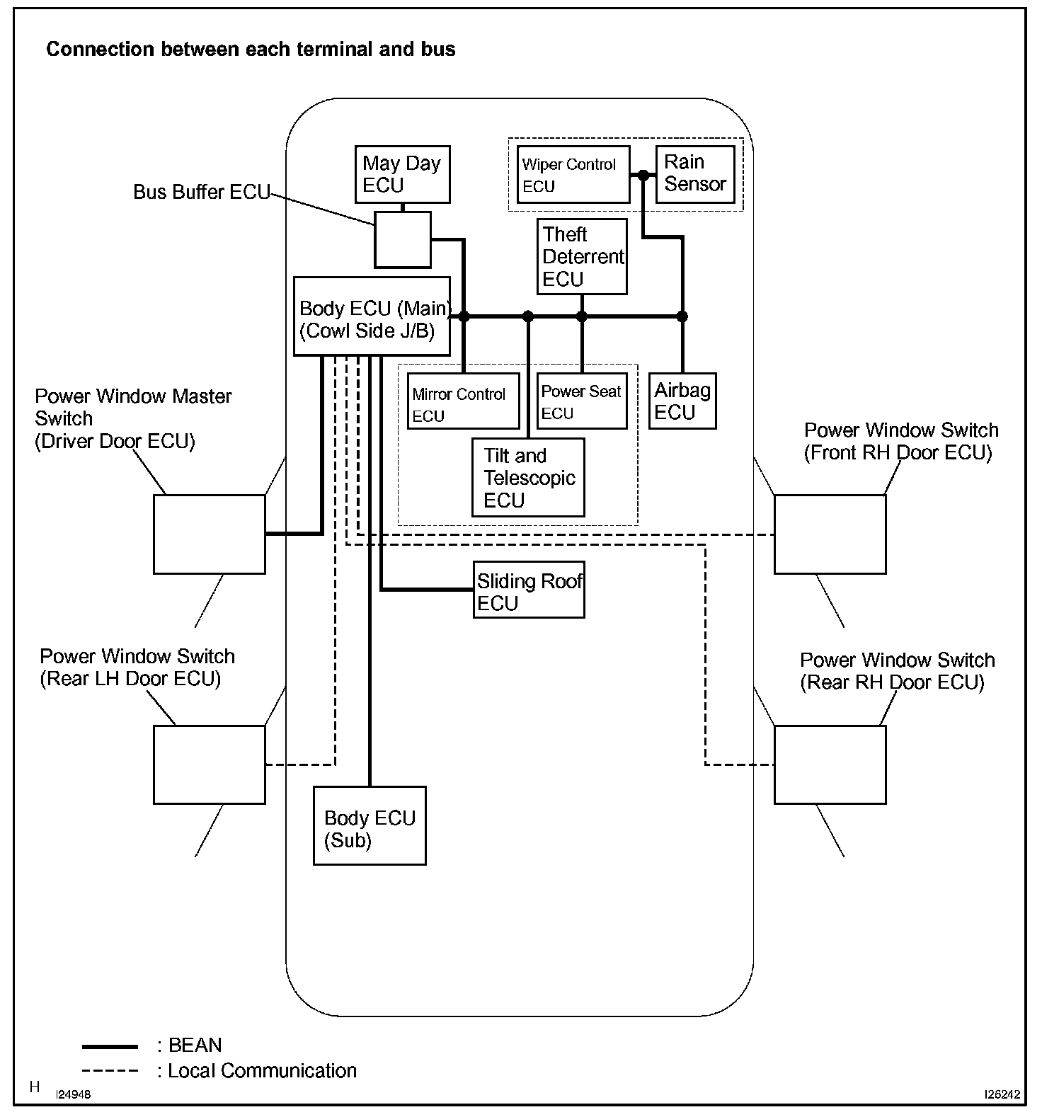 DIAGNOSIS SYSTEMa. As shown in the diagram, all ECU on this vehicle are connected each other via communication buses through which various signals are transmitted. These communication buses are diagnosed by the Body ECU (Main). When the Body ECU (Main) detects a communication error between ECU, or B+ short or GND short of a communication bus, a DTC is output and stored. The Body ECU (Main) cannot diagnose accurately unless it can function normally. Therefore, first confirm the normal condition by performing a "BASIC INSPECTION" described later, and then, troubleshoot against each DTC.