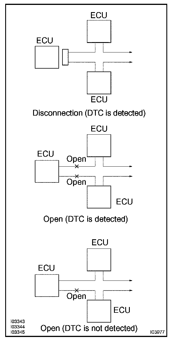 b. If DTC of ECU communication stop is output, connectors may be disconnected, or communication buses may be open at 2 points. It will not become abnormal with only 1 communication bus open.
