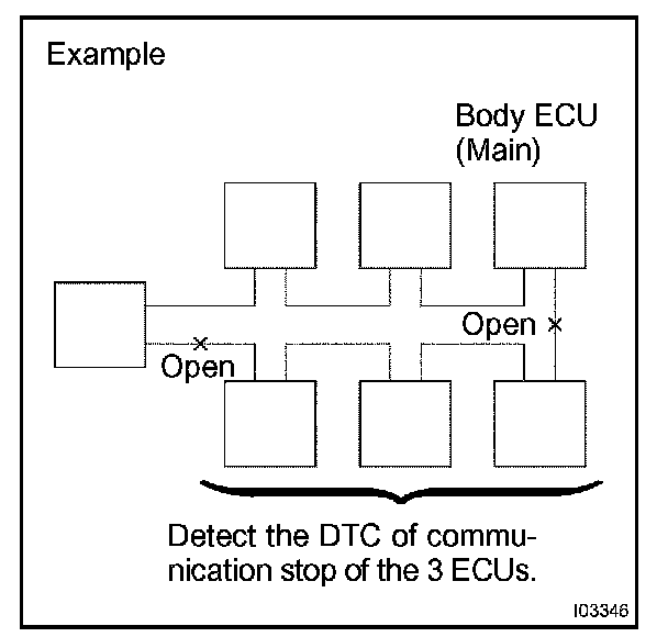 c. If 2 communication buses are open at the position as shown in the illustration, DTC of ECU communication stop between those 2 buses is output.