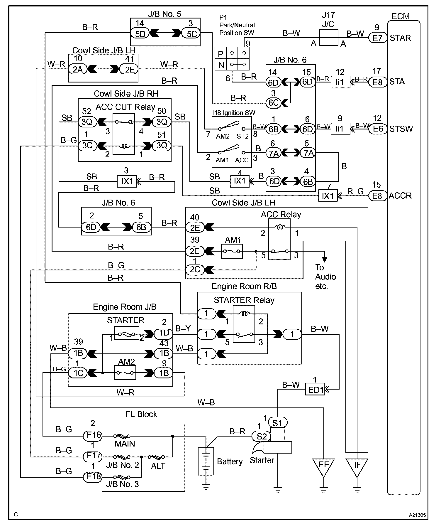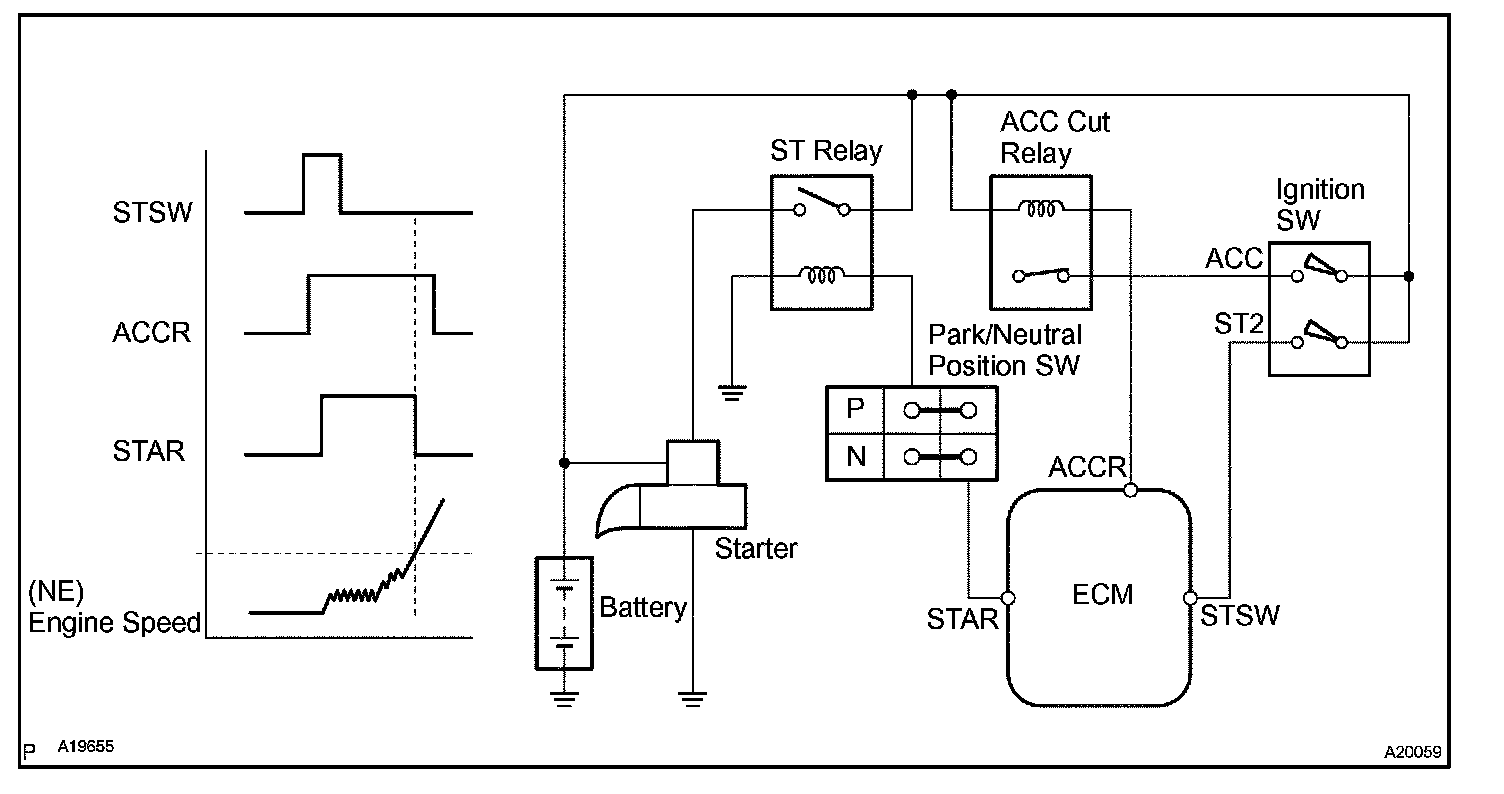 The starter is controlled by the ECM, when the ECM detects a start signal (STSW) from the ignition switch, this system monitors the engine speed (NE) and continues to operate the starter until it has determined that the engine has started (engine speed reaches approximately 500 rpm). If the engine is already running and the ignition switch is turned to START, the ECM will not operate the starter.