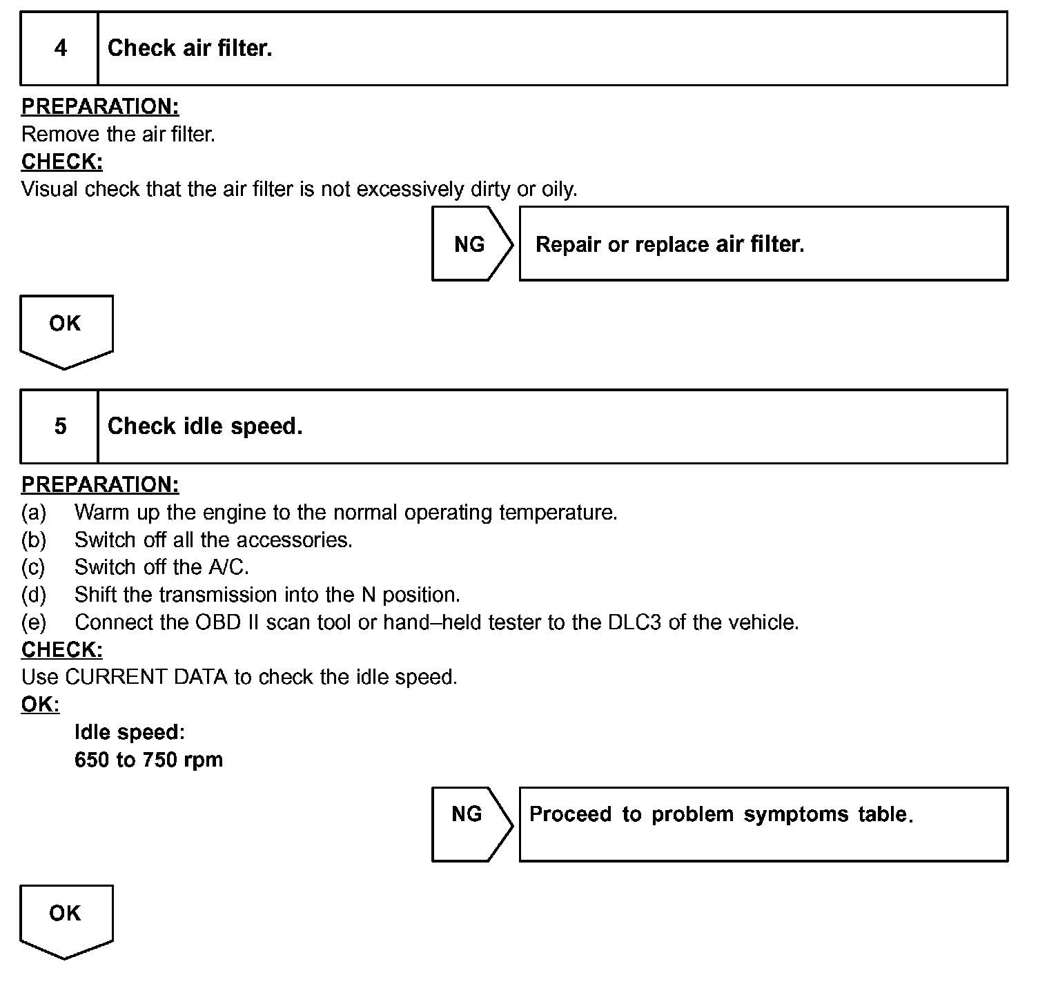 When the malfunction is not confirmed in the DTC check, troubleshooting should be carried out in all the possible circuits considered as causes of the problem. In many cases, by carrying out the basic engine check shown in the following flowchart, the location causing the problem can be found quickly and efficiently. Therefore, using this check is essential in the engine troubleshooting.