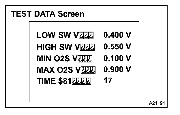 If the TEST DATA value appearing on the scan tool is out of the standard value, the O2S is malfunctioning. If it is within the standard value, the O2S is functioning normally. However, if the value is on the borderline of the standard value, the O2S may malfunction very soon.