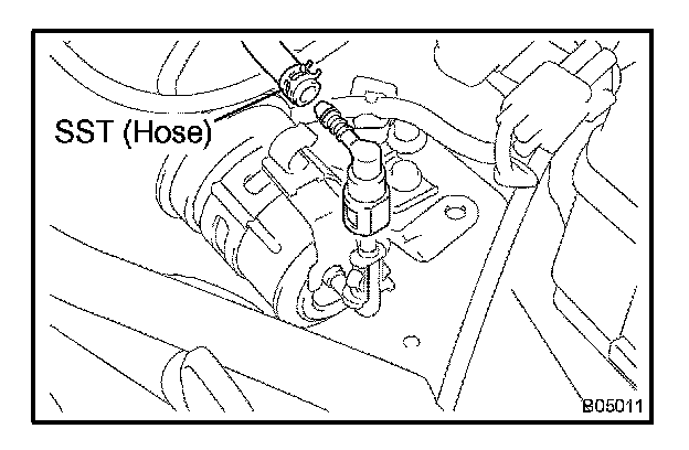 c. Connect SST (hose) and fuel tube connector to the fuel filter outlet.