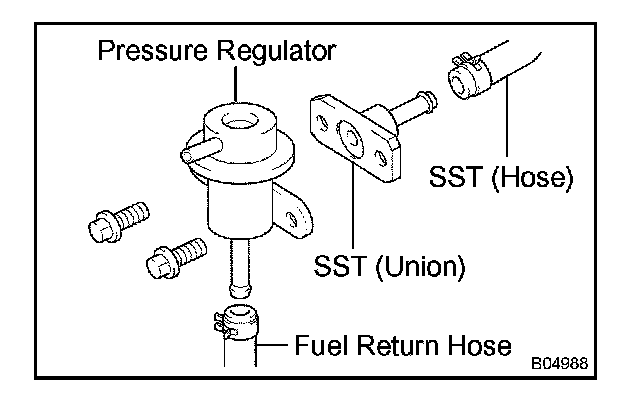 f. Connect SST (hose) to the fuel inlet of the pressure regulator with SST (union) and the 2 bolts.
