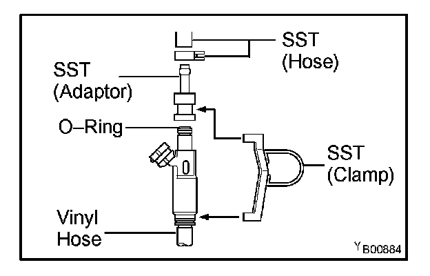 i. Connect SST (adaptor and hose) to the injector, and hold the injector and union with SST (clamp).