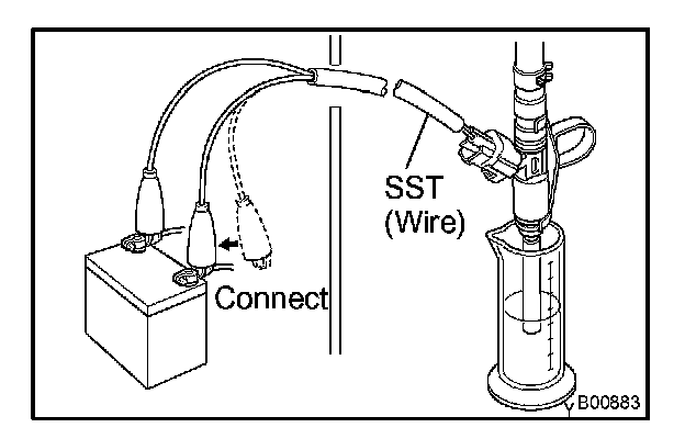 q. Connect SST (wire) to the injector and the battery for 15 seconds, and measure the injection volume with a graduated cylinder. Test each injector 2 or 3 times.