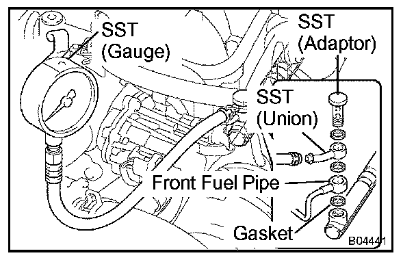 d. Install the front fuel pipe and SST (pressure gauge) to the delivery pipe with the 3 lower gaskets and SST (adaptor).