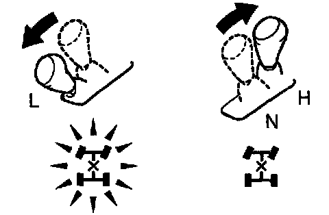 b. Check that the center cliff. indicator light comes on when the transfer shift lever is shifted to the "L" position. Check that the light goes off when the lever is shifted to the "N" or "H" position.
