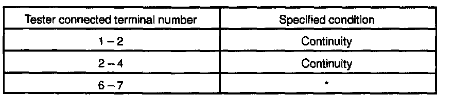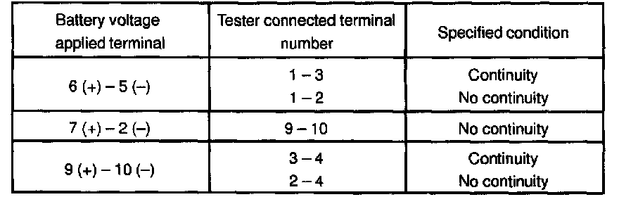 b. Apply battery positive voltage between each terminal and check that continuity exists between each terminal, as shown in the chart.