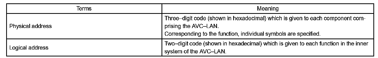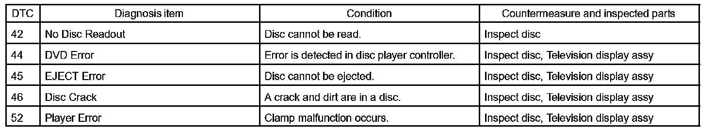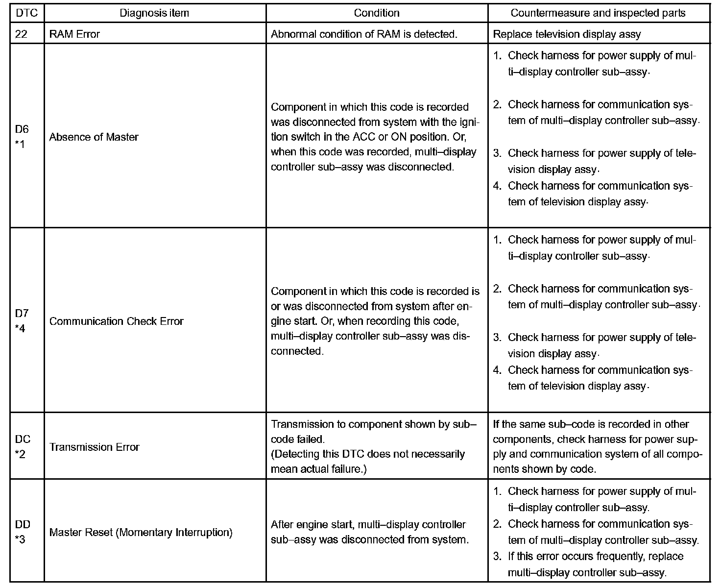 DIAGNOSTIC TROUBLE CODE CHARTHINT: The DTC of the Main AVC-LAN circuit is displayed on the radio receiver assy, and the DTC of the Sub AVC- LAN circuit is displayed on the multi-display controller sub-assy.