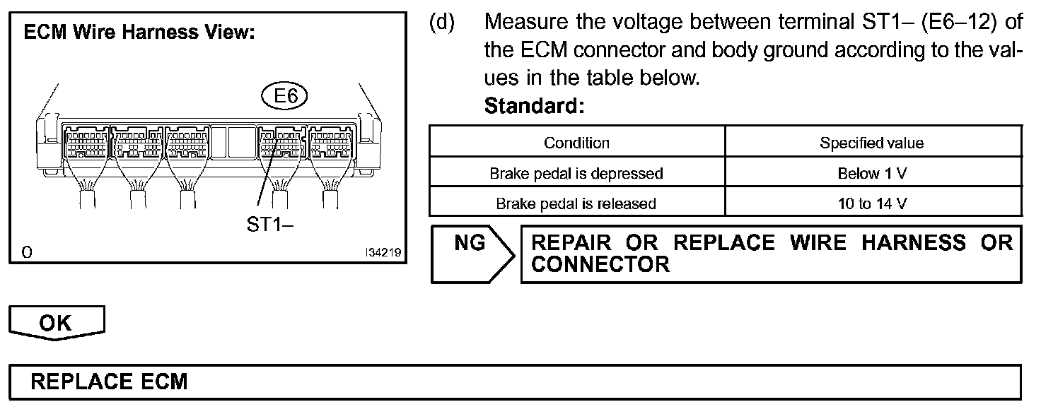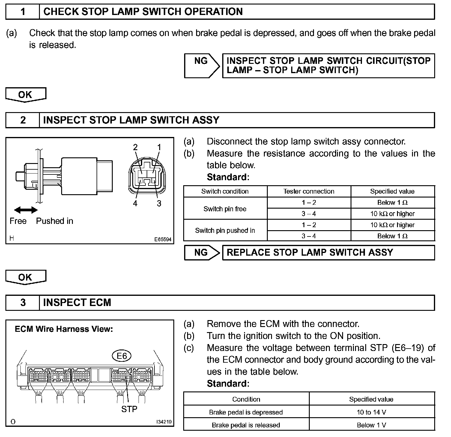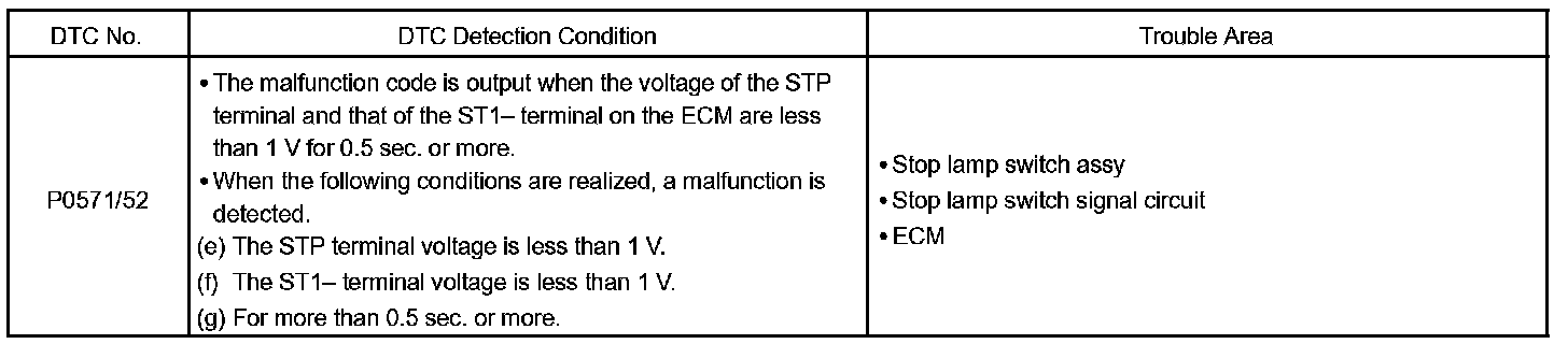 When the brake pedal is on, positive battery voltage is normally applied through the STOP fuse and the stop lamp switch assy to terminal STP of the ECM, and then the ECM turns the cruise control OFF.