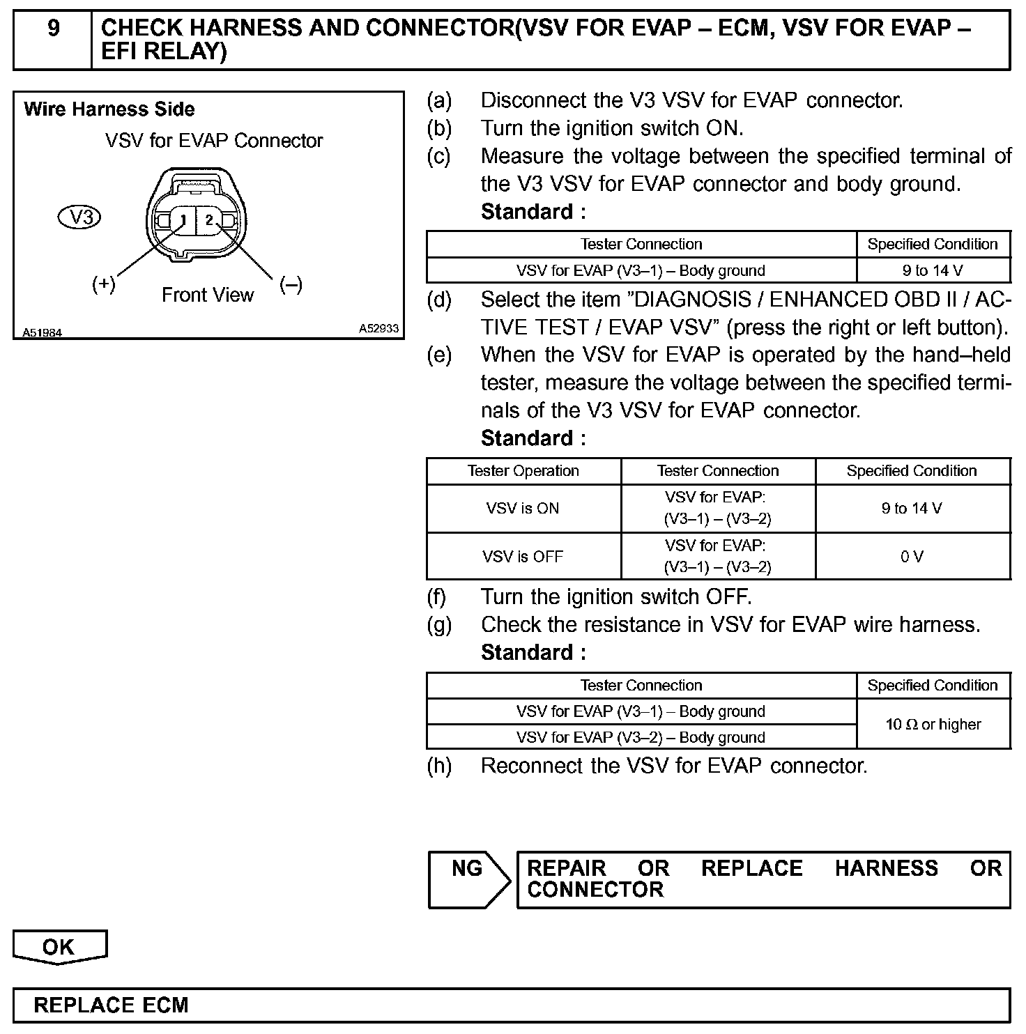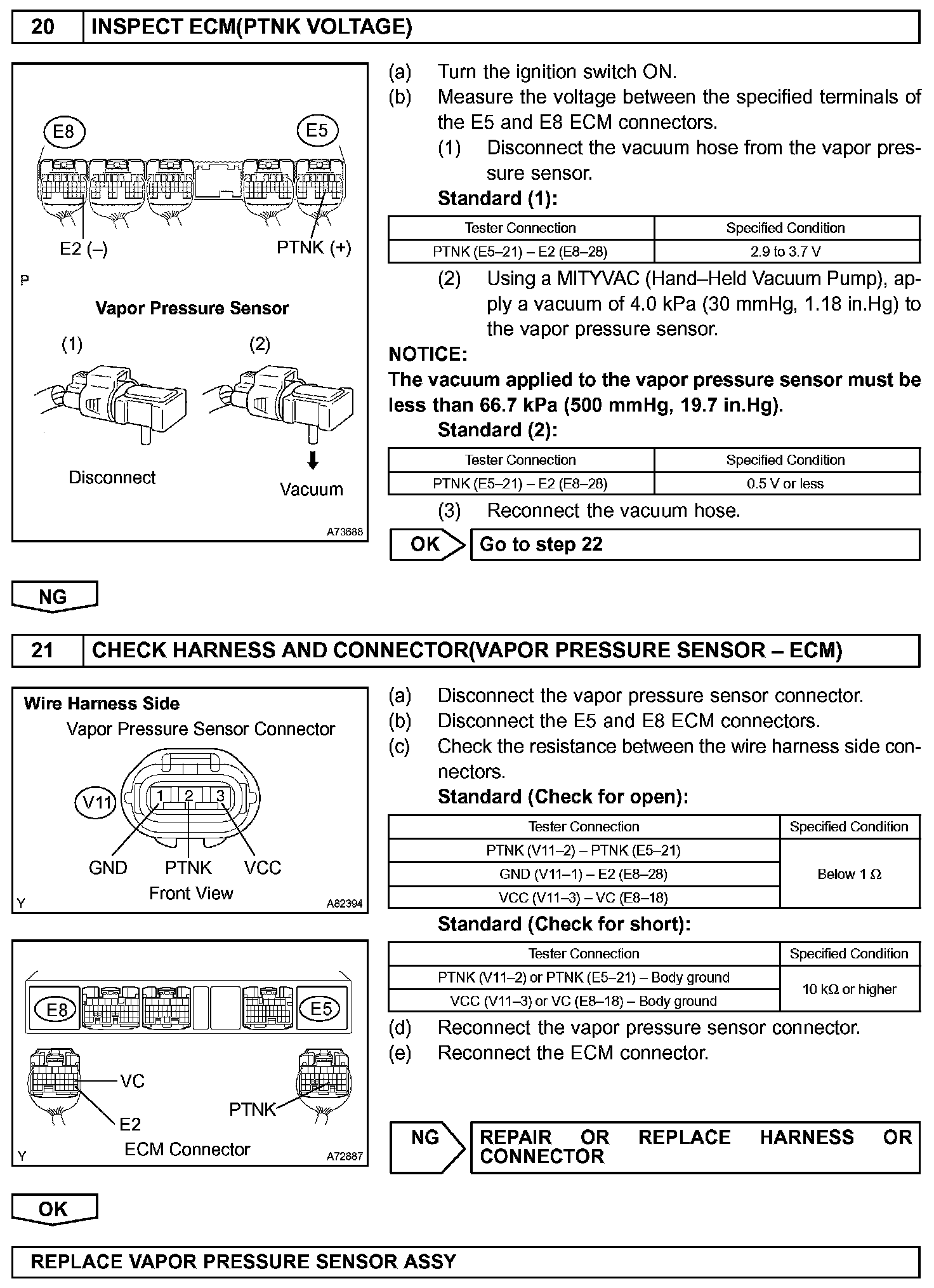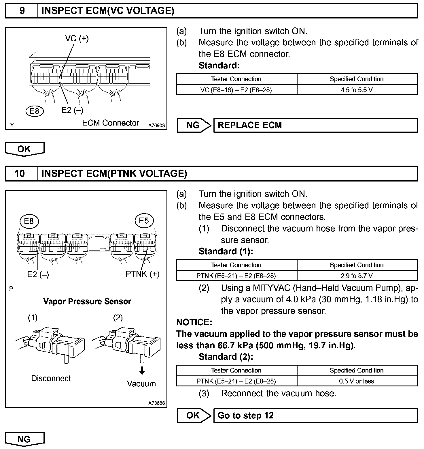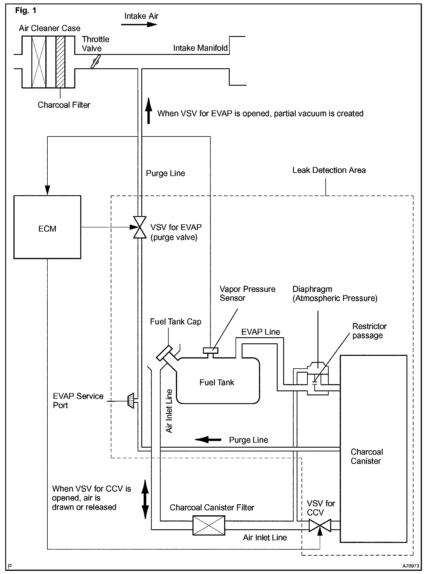 The ECM tests the evaporative emissions (EVAP) system using the fuel tank pressure sensor, the canister close valve (CCV), and the VSV for EVAP. The ECM closes the EVAP system and introduces a negative pressure (vacuum) into it. The ECM then monitors the internal pressure using the fuel tank pressure sensor. (Refer to graphic)