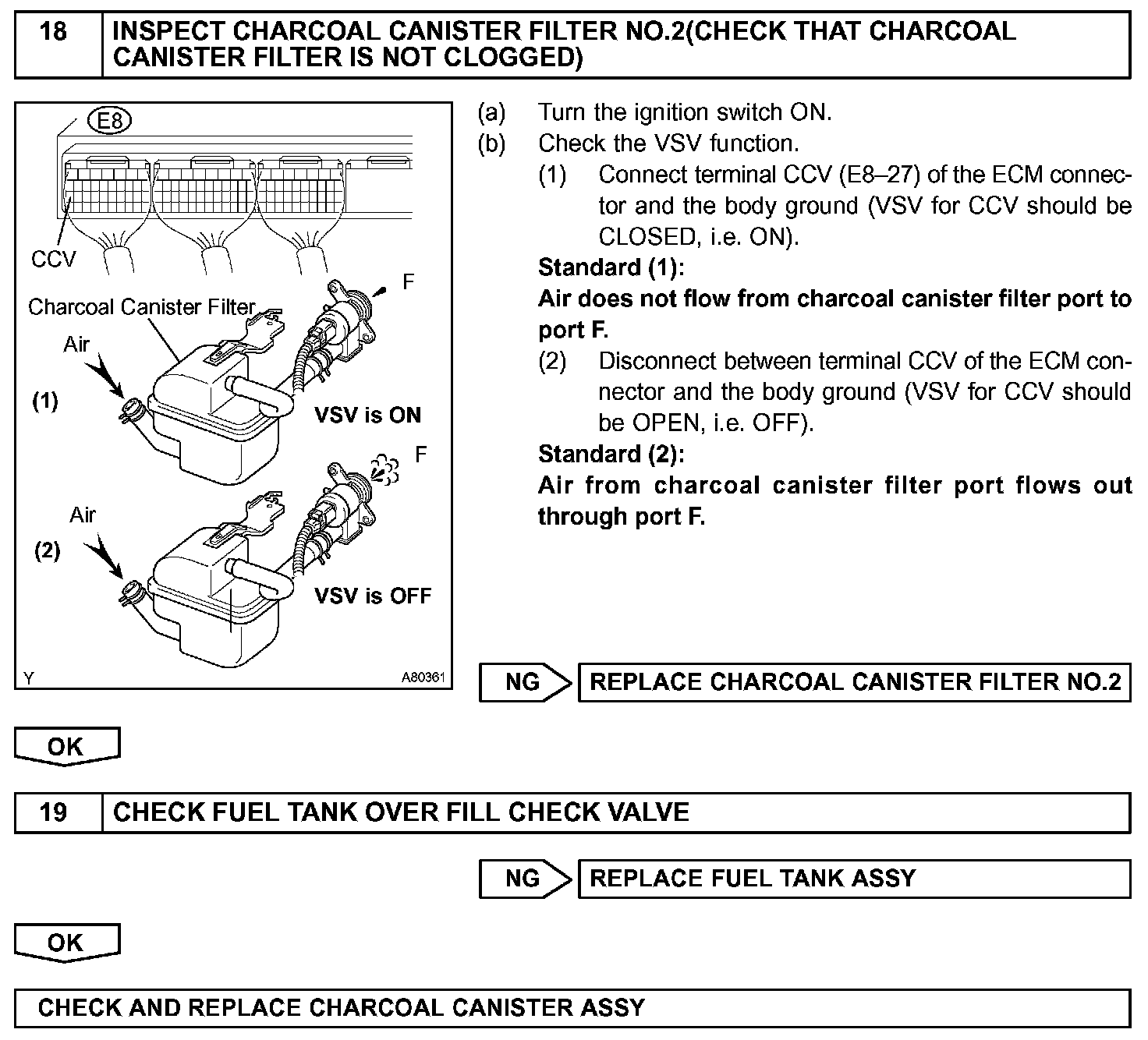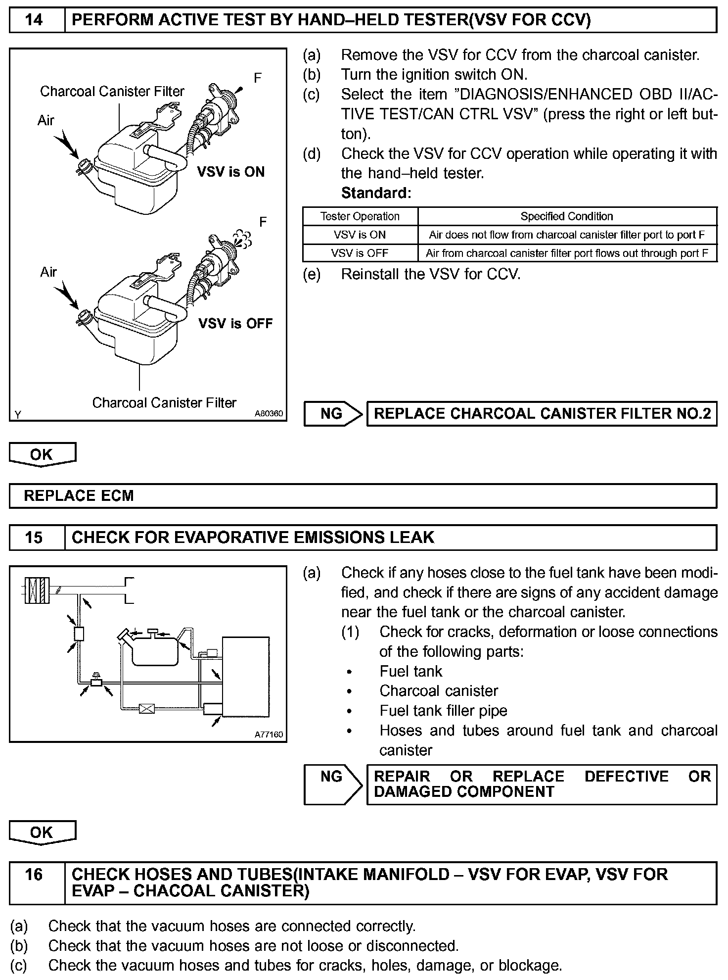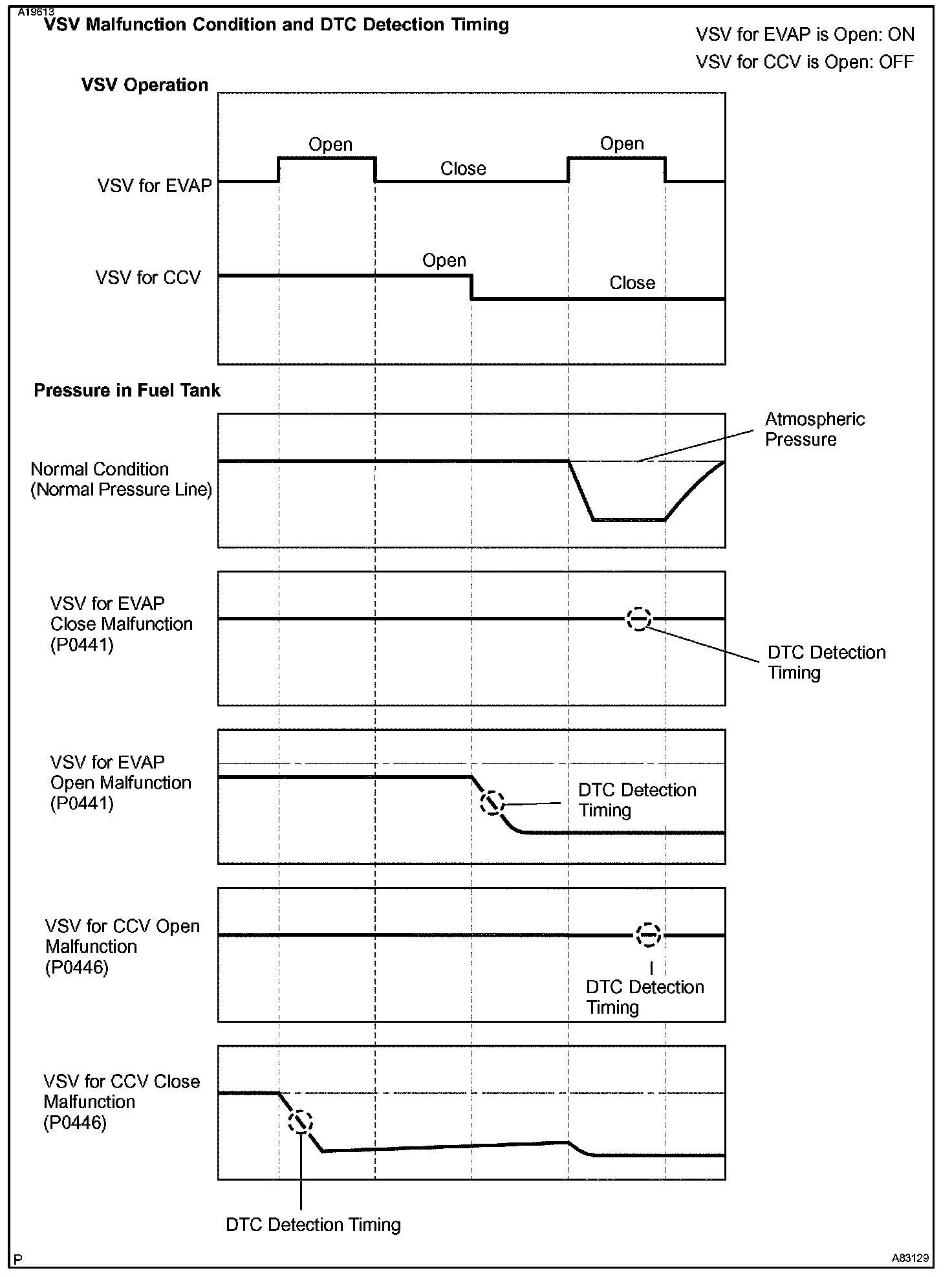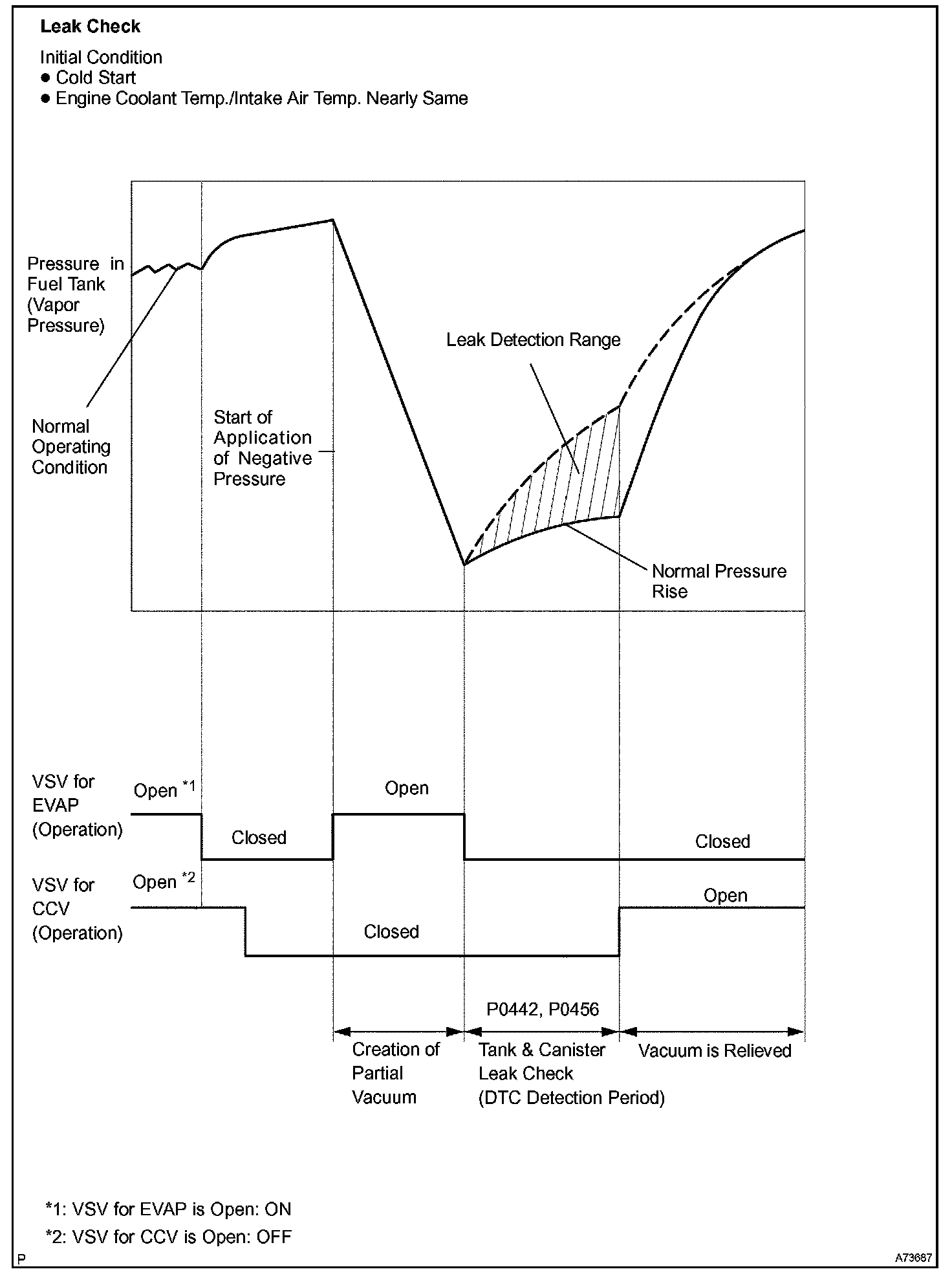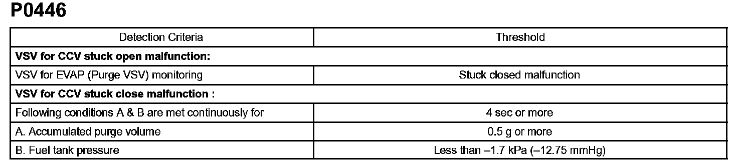 The ECM checks for a VSV for CCV "stuck open" malfunction by commanding both valves closed at a time when the fuel tank should have developed a high negative pressure (vacuum). If the fuel tank did not develop the proper high negative pressure (vacuum), the ECM concludes that the VSV for CCV must have been "stuck open". The ECM will turn on the MIL and a DTC is set.