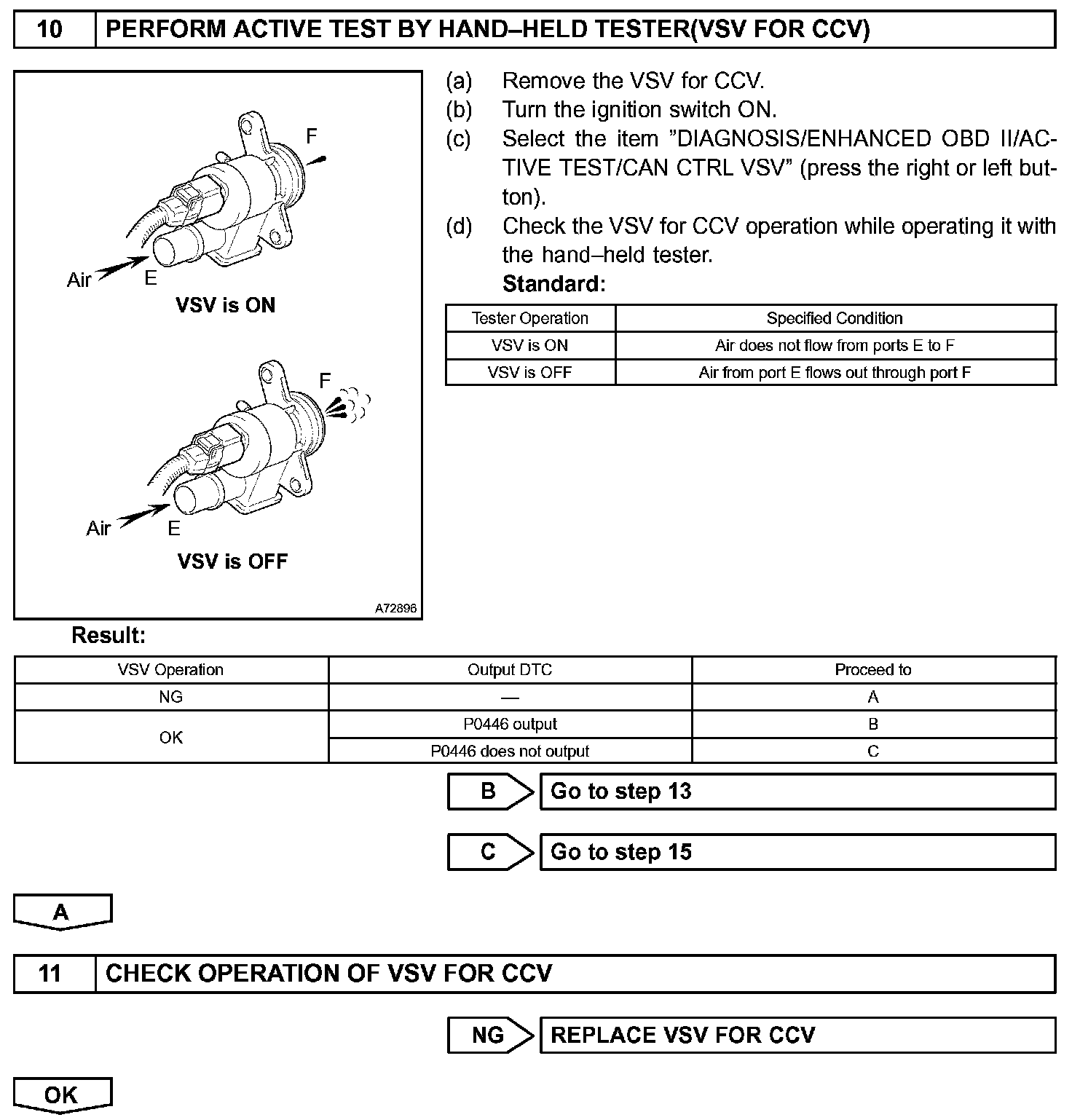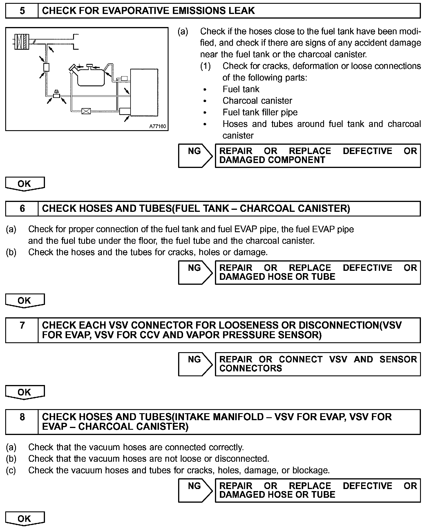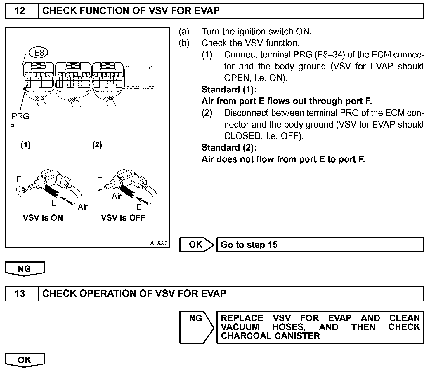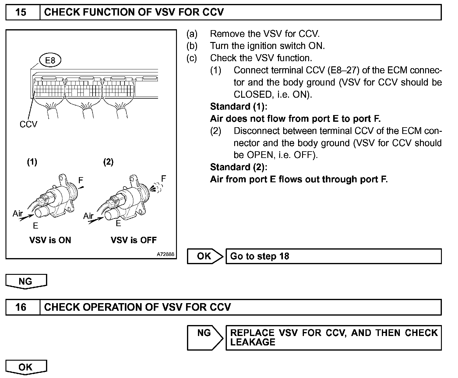 The ECM checks for a VSV for CCV "stuck open" malfunction by commanding both valves closed at a time when the fuel tank should have developed a high negative pressure (vacuum). If the fuel tank did not develop the proper high negative pressure (vacuum), the ECM concludes that the VSV for CCV must have been "stuck open". The ECM will turn on the MIL and a DTC is set.