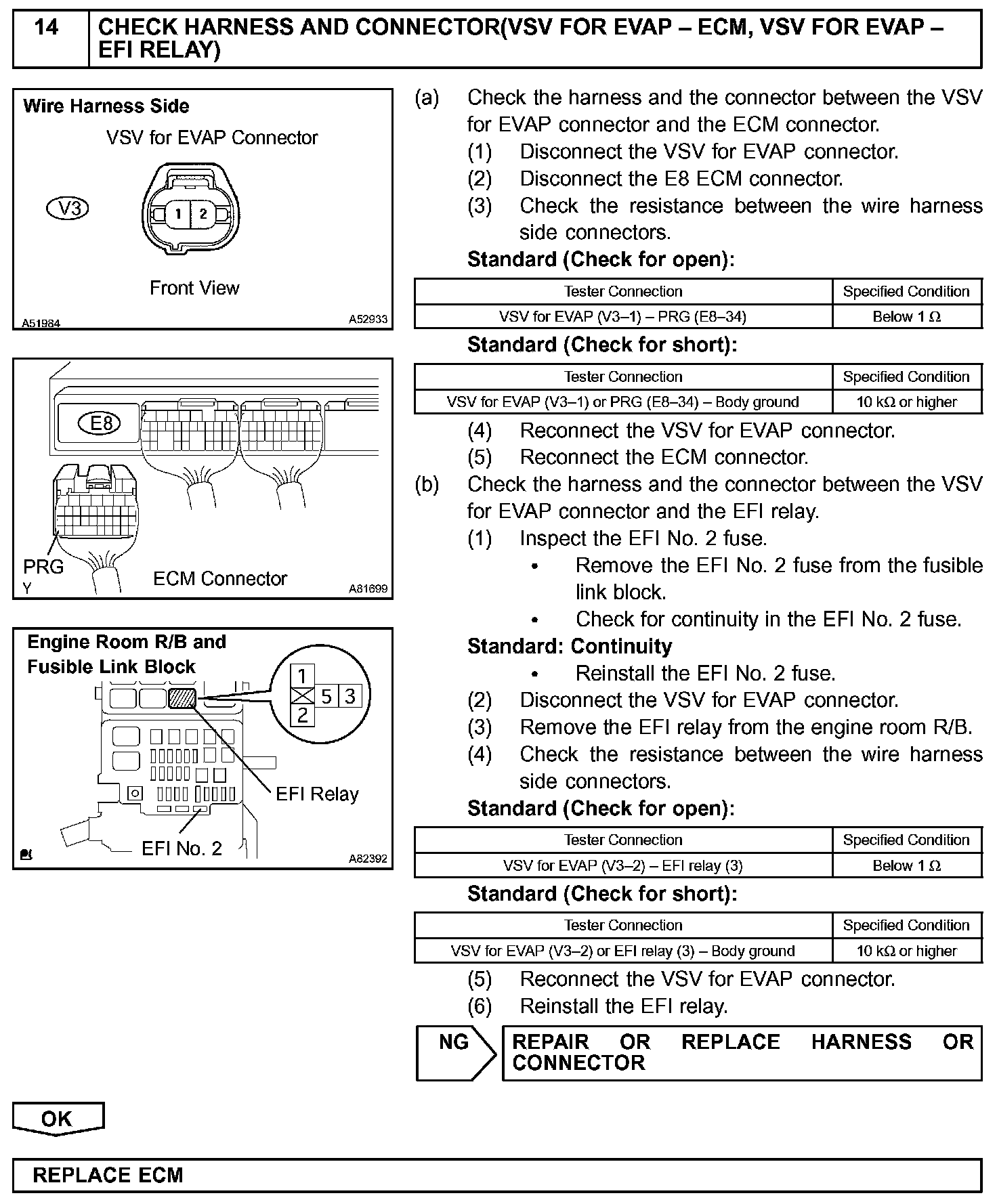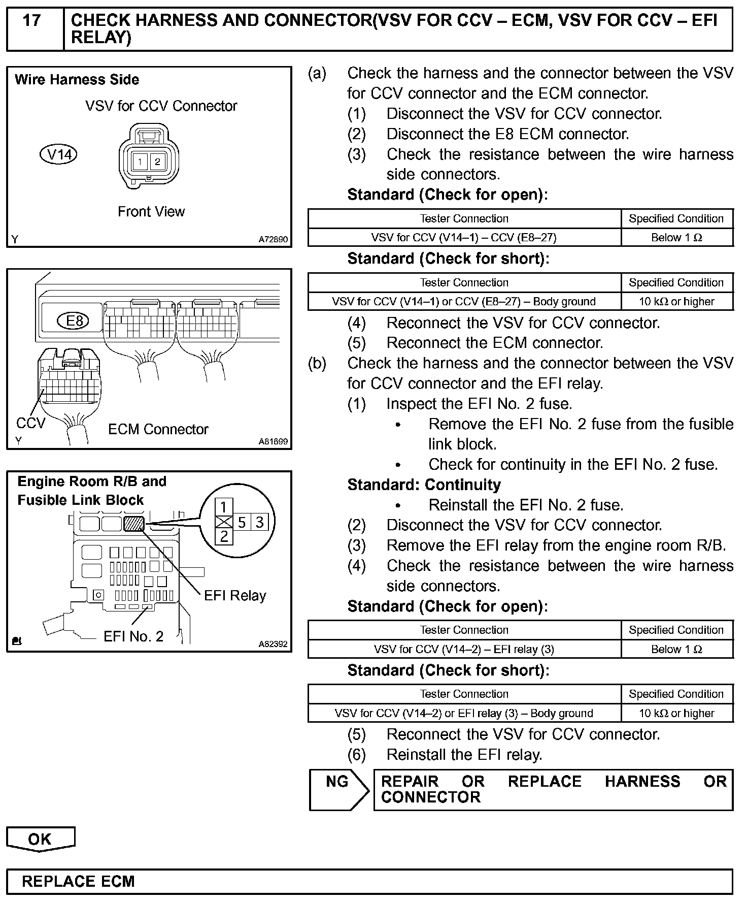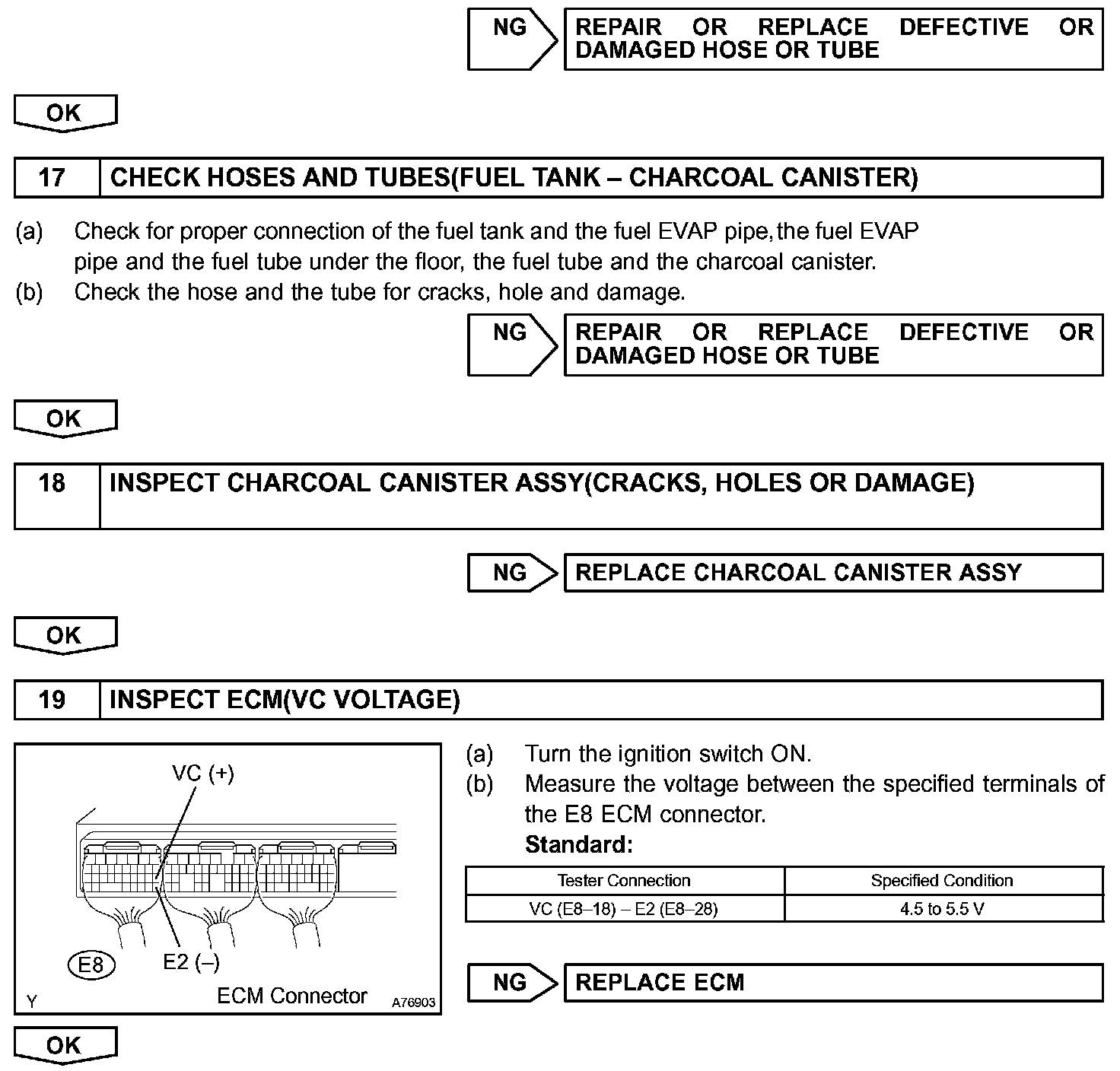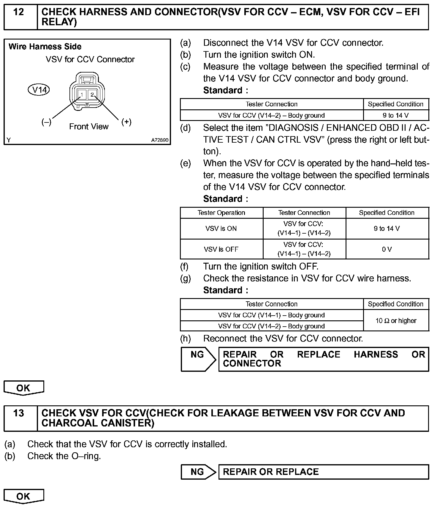 The ECM checks for a VSV for CCV "stuck open" malfunction by commanding both valves closed at a time when the fuel tank should have developed a high negative pressure (vacuum). If the fuel tank did not develop the proper high negative pressure (vacuum), the ECM concludes that the VSV for CCV must have been "stuck open". The ECM will turn on the MIL and a DTC is set.